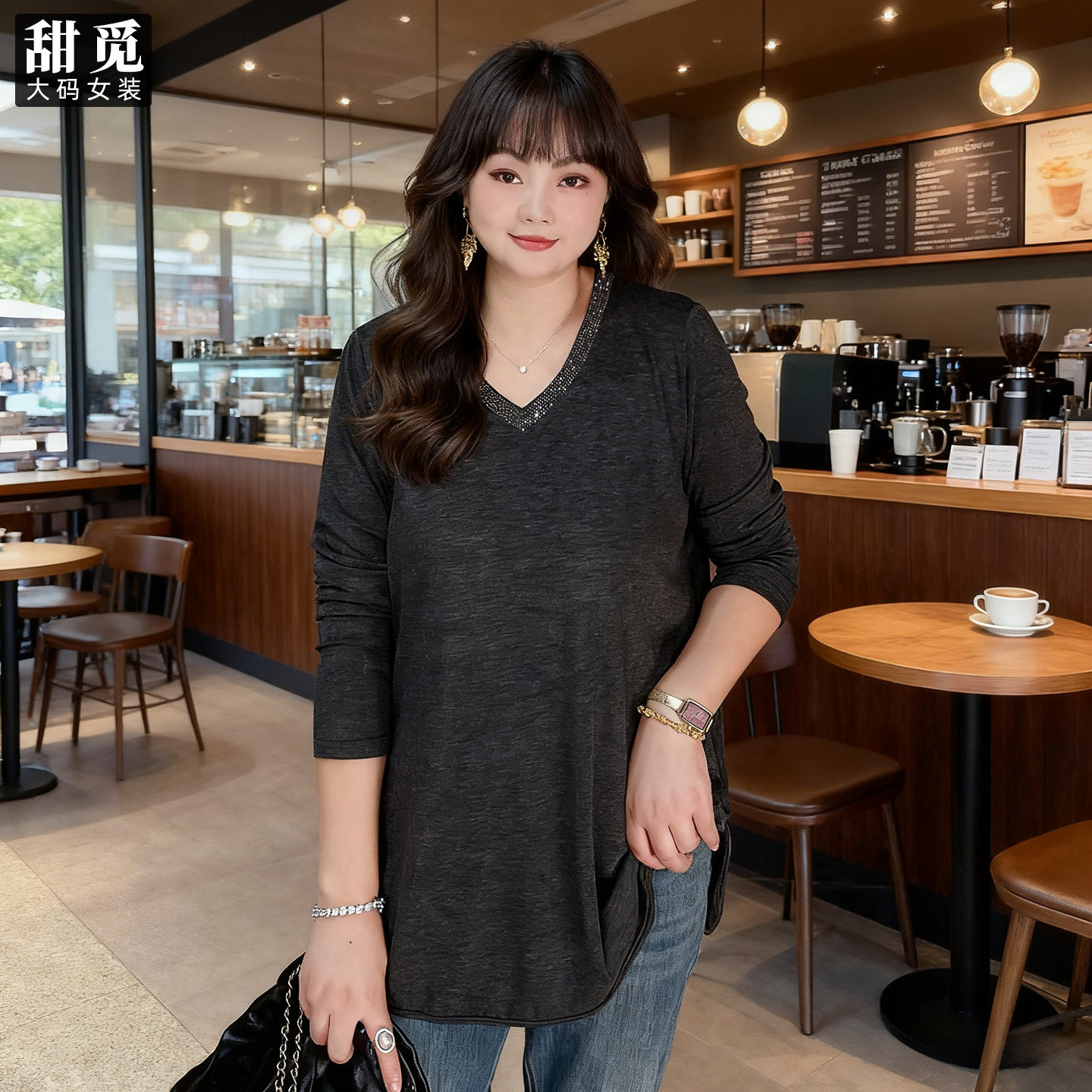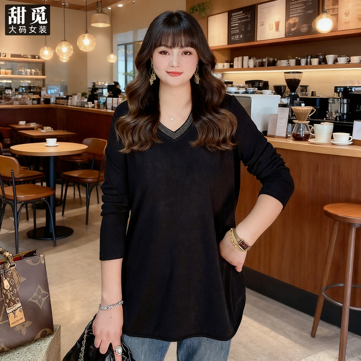 女装 针织衫 2025春秋装 精致烫钻V领中长款 胖mm300斤时尚 甜觅特大码