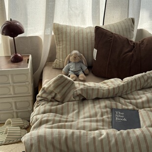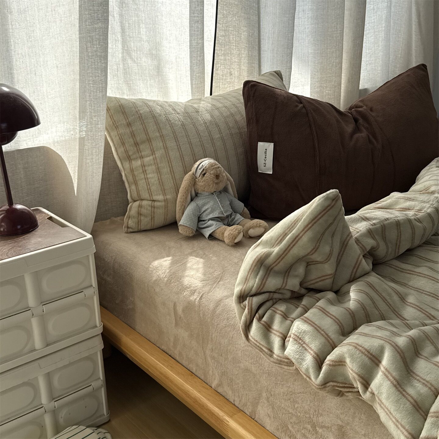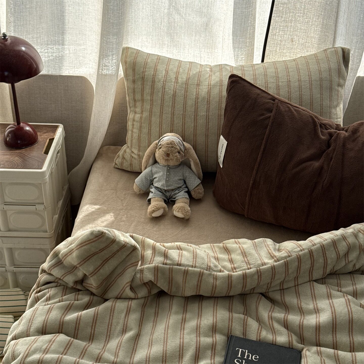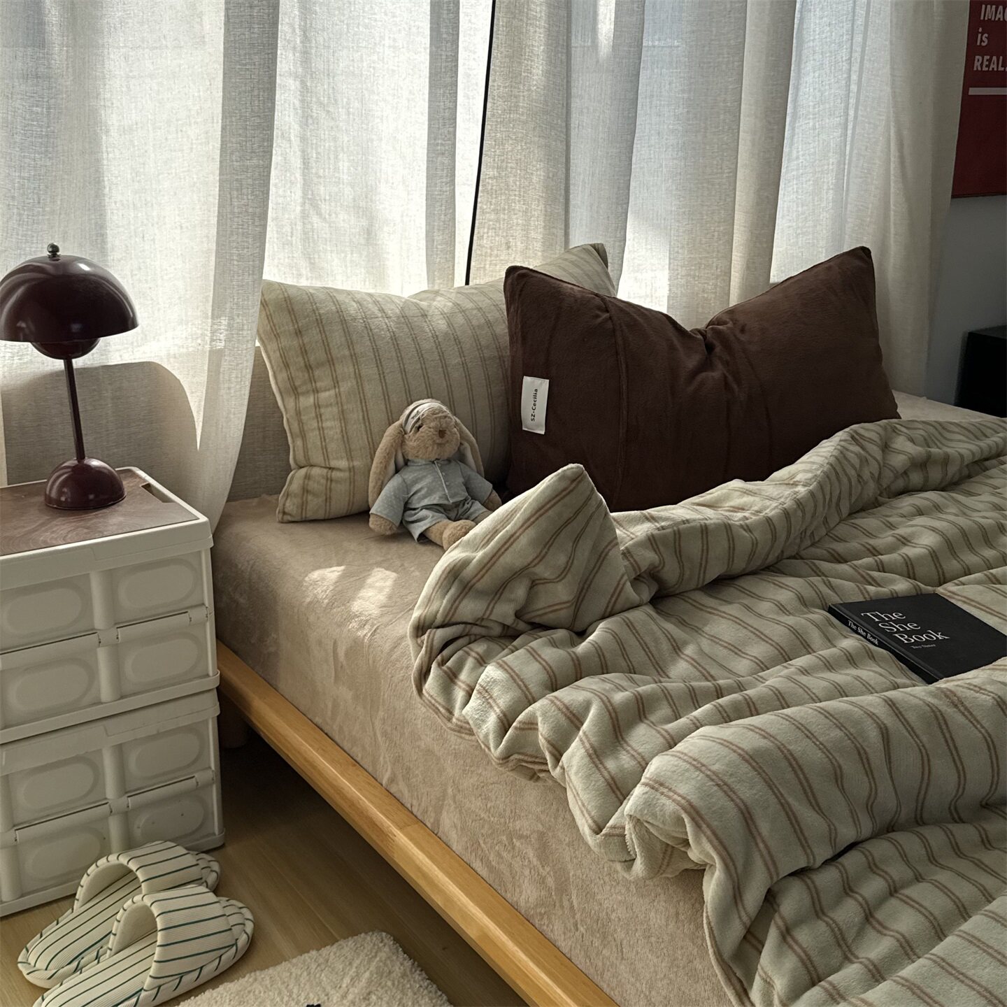 中古博主混搭ins简约条纹牛奶绒四件套冬天珊瑚绒法兰绒三件套1.8