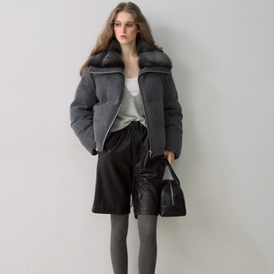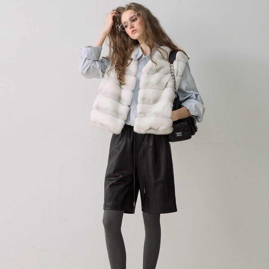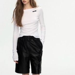 女 抽绳松紧腰休闲百搭直筒短裤 Deessesicile绵羊皮五分裤 真皮中裤
