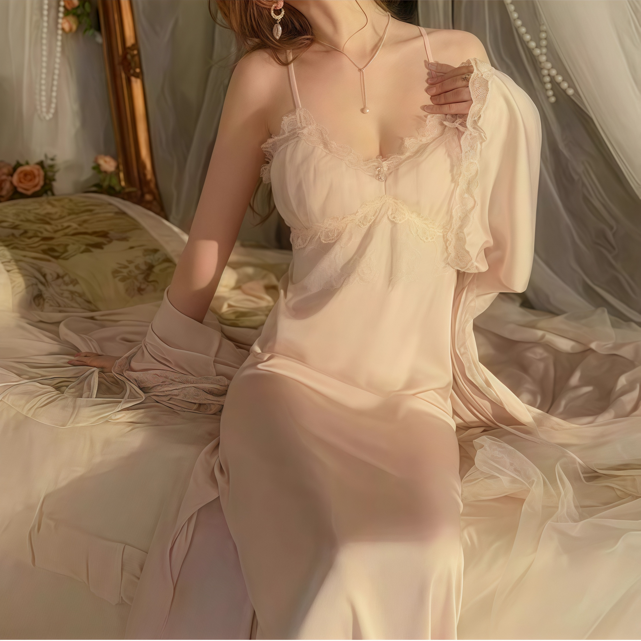 性感纯欲风睡裙家居服套装 带胸垫一体法式 长袖 莫代尔睡衣女春秋季