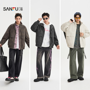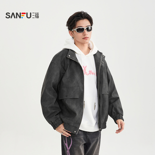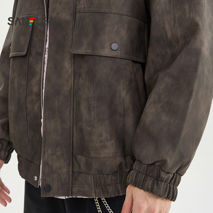 三福2025冬季 蜡染PU皮衣夹克男加绒复古大口袋宽松外套510052 满版