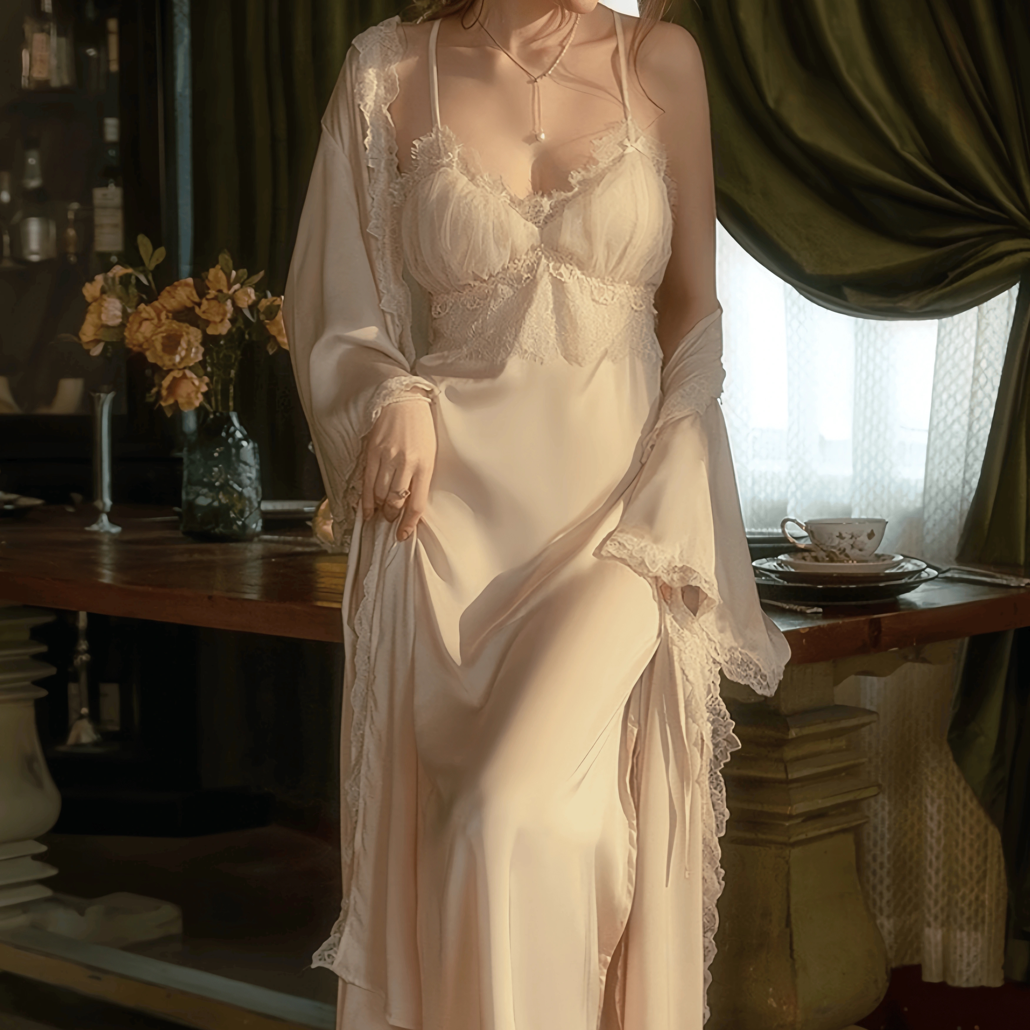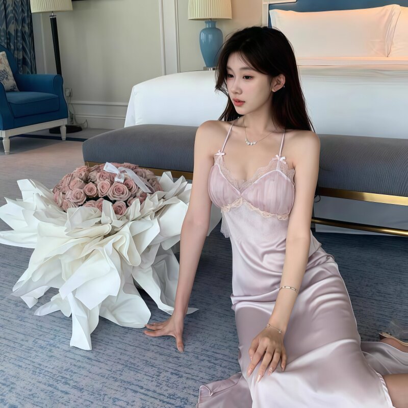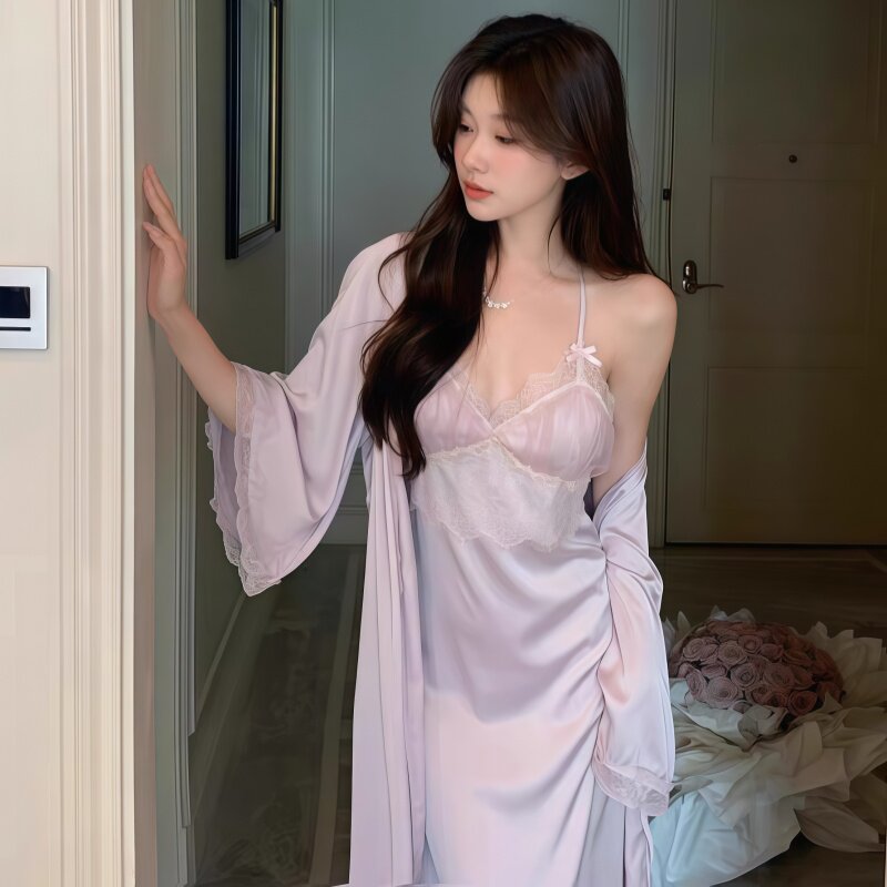 法式 性感晨袍带胸垫睡裙蕾丝吊带睡袍两件套长裙真丝睡衣女春秋款