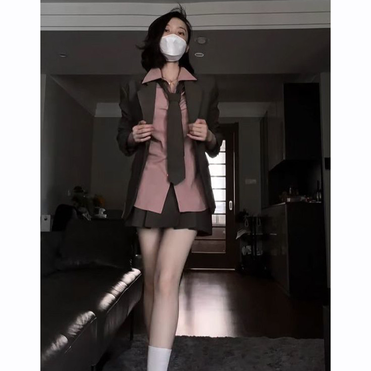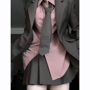粉色衬衫 韩系通勤气质套装 干练风西装 新款 百褶短裙三件套 女秋季