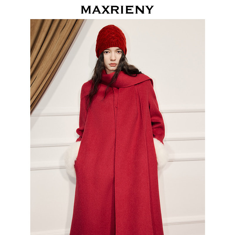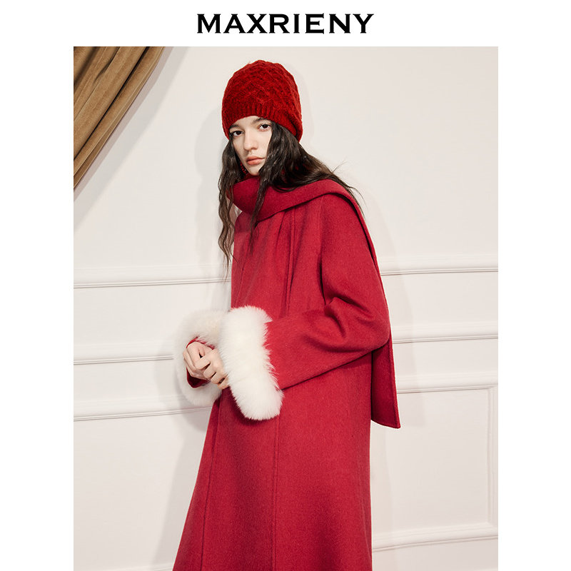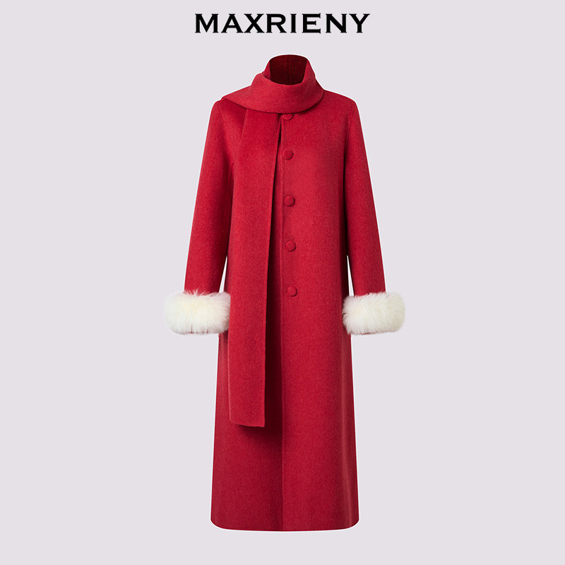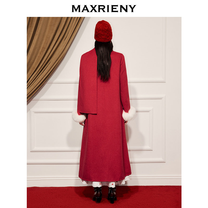 狐狸毛袖 MAXRIENY节庆穿搭羊毛大衣超长款 围巾毛呢外套 商场同款