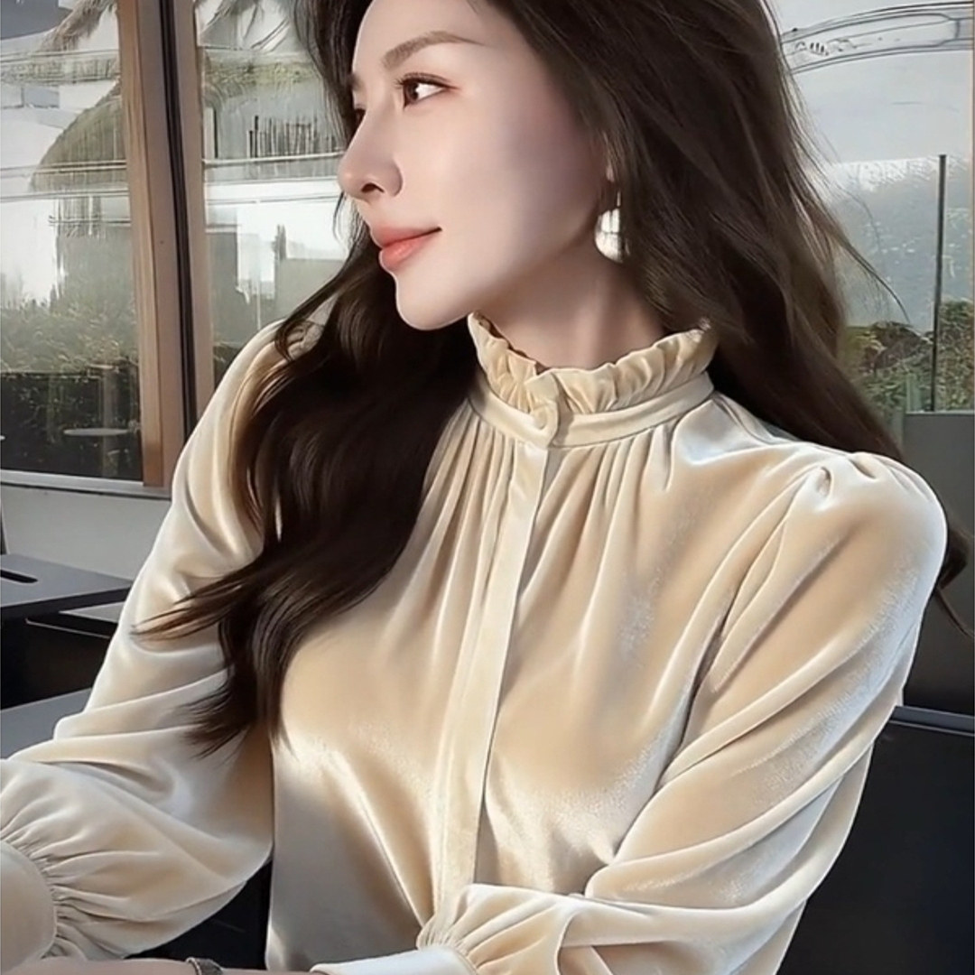 内搭衬衫 高级感轻奢气质杏色丝绒上衣女2025秋冬新款 独特漂亮法式