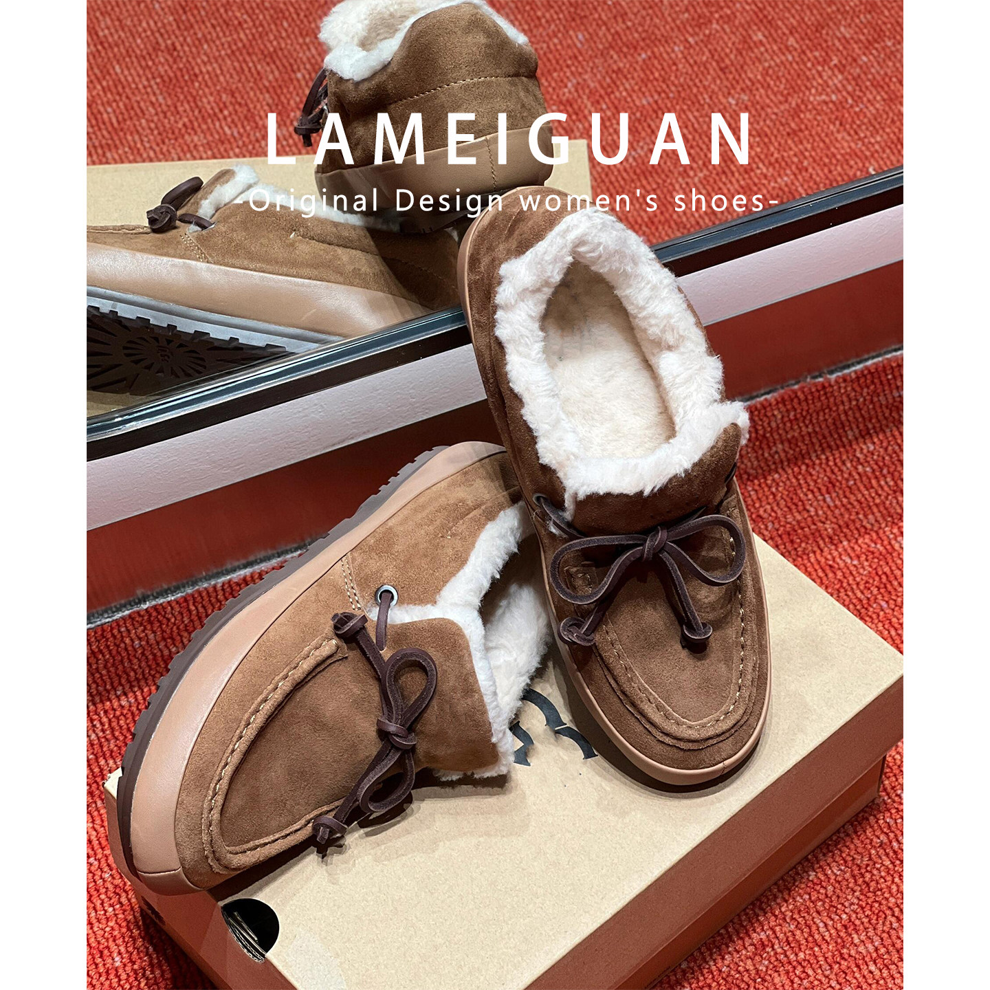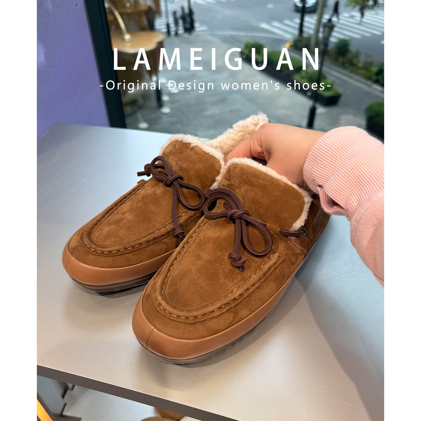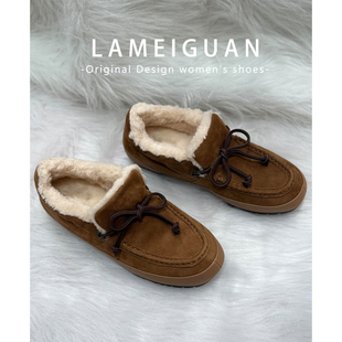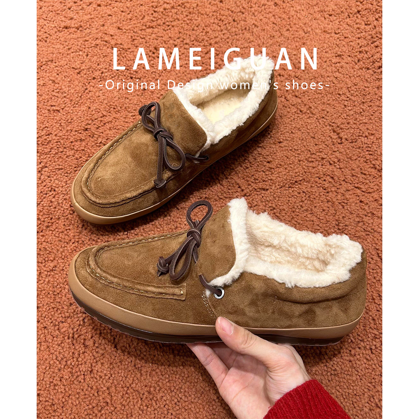 平底一脚蹬毛毛豆豆棉鞋 复古棕色真皮加绒深口单鞋 女2025秋冬新款