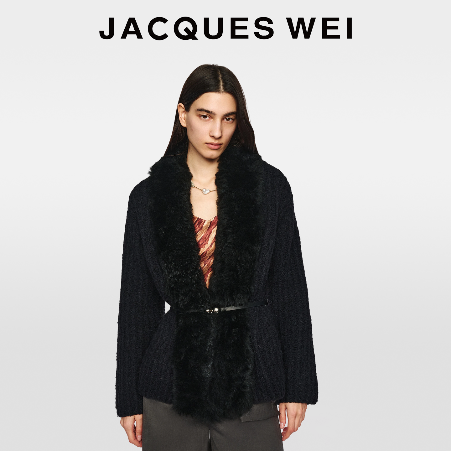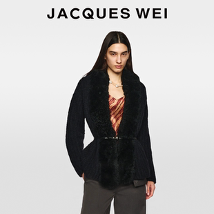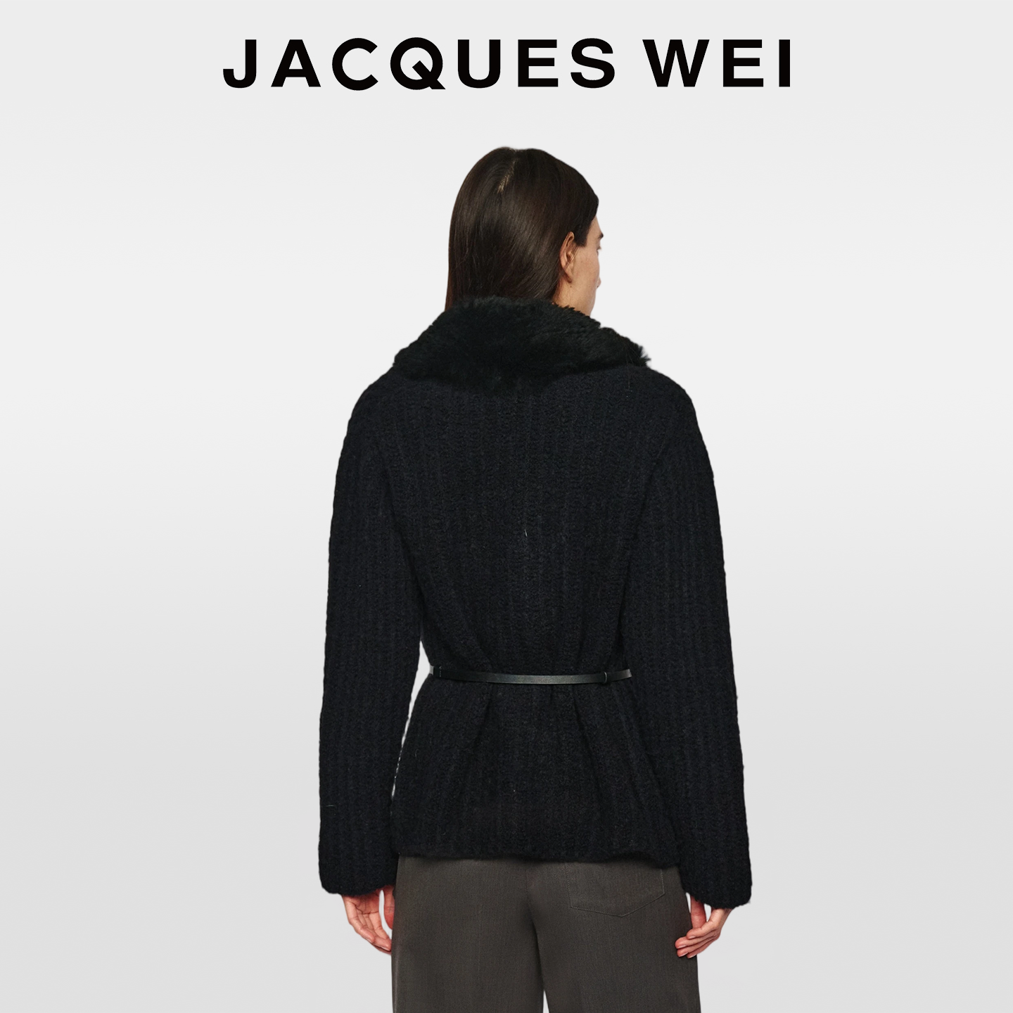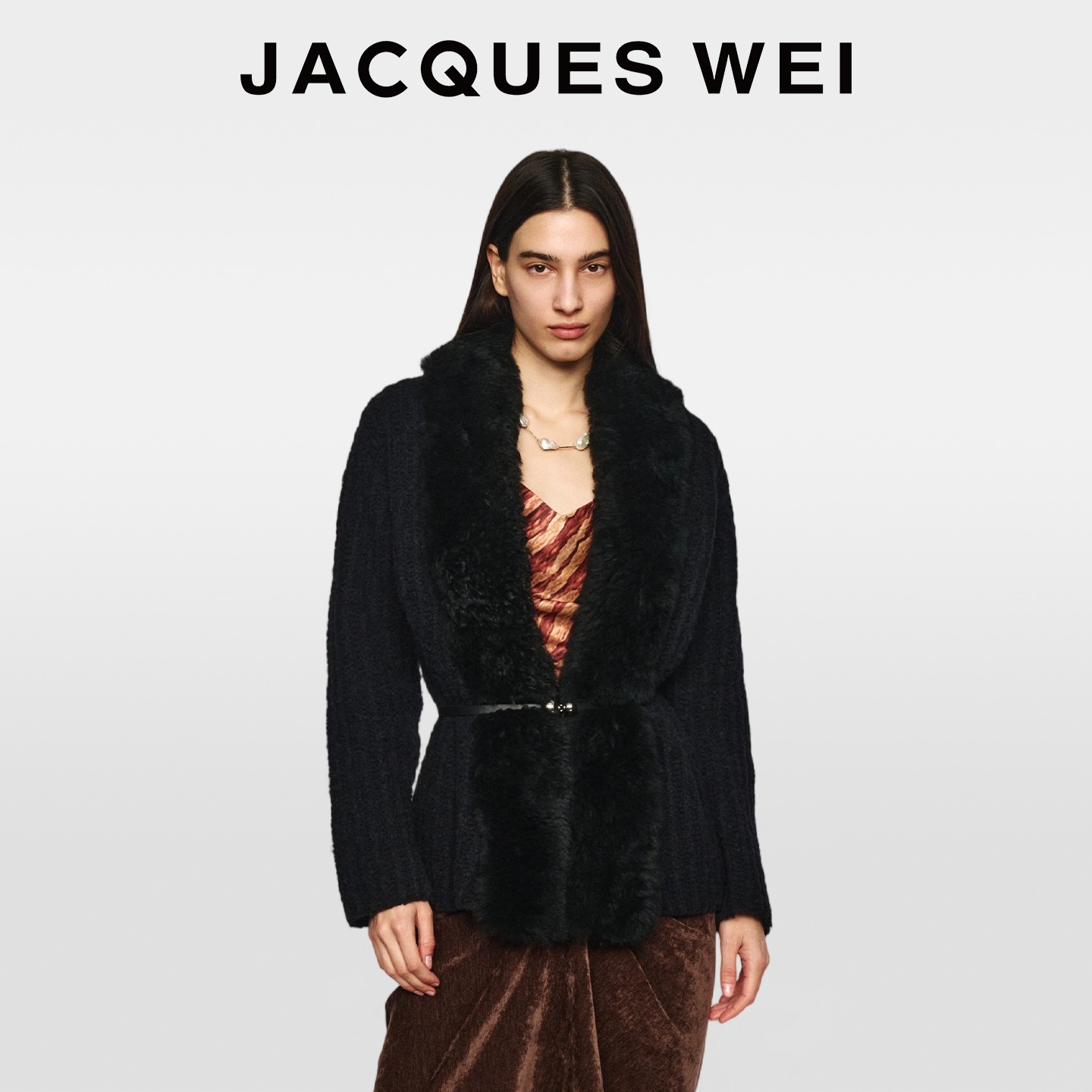 冬季 JACQUES 2025新款 毛衣女款 WEI新年黑色毛领羊毛针织腰带开衫