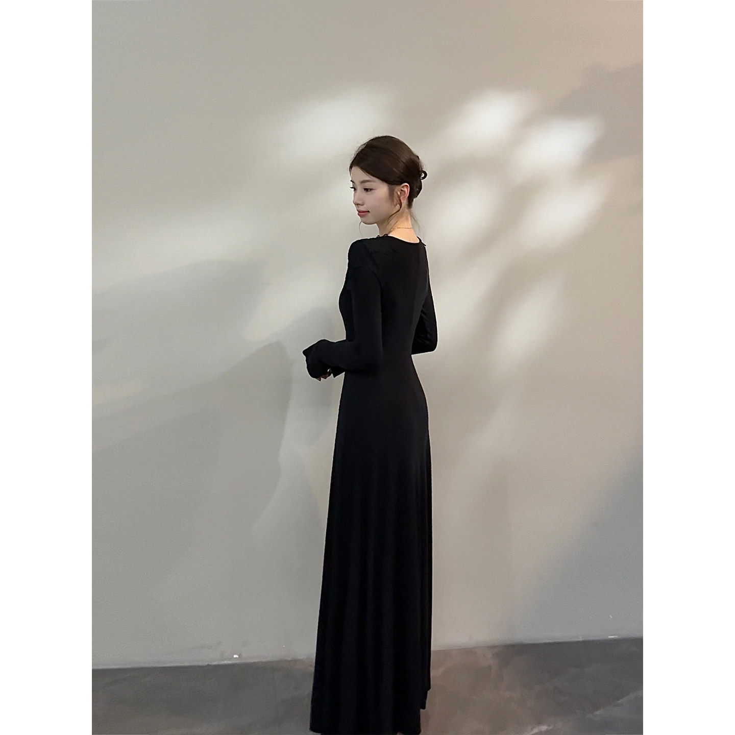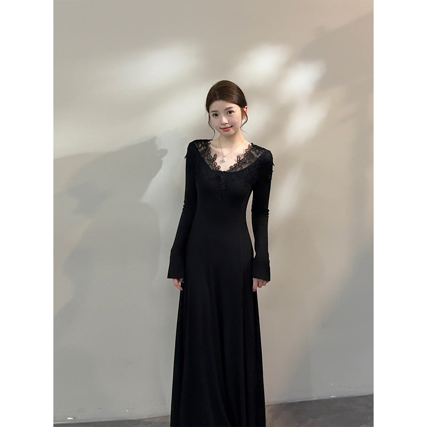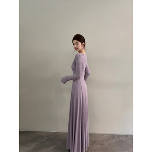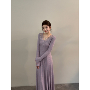 颂宋 秋冬温柔风蕾丝V领针织连衣裙优雅气质收腰显瘦长裙DT1703