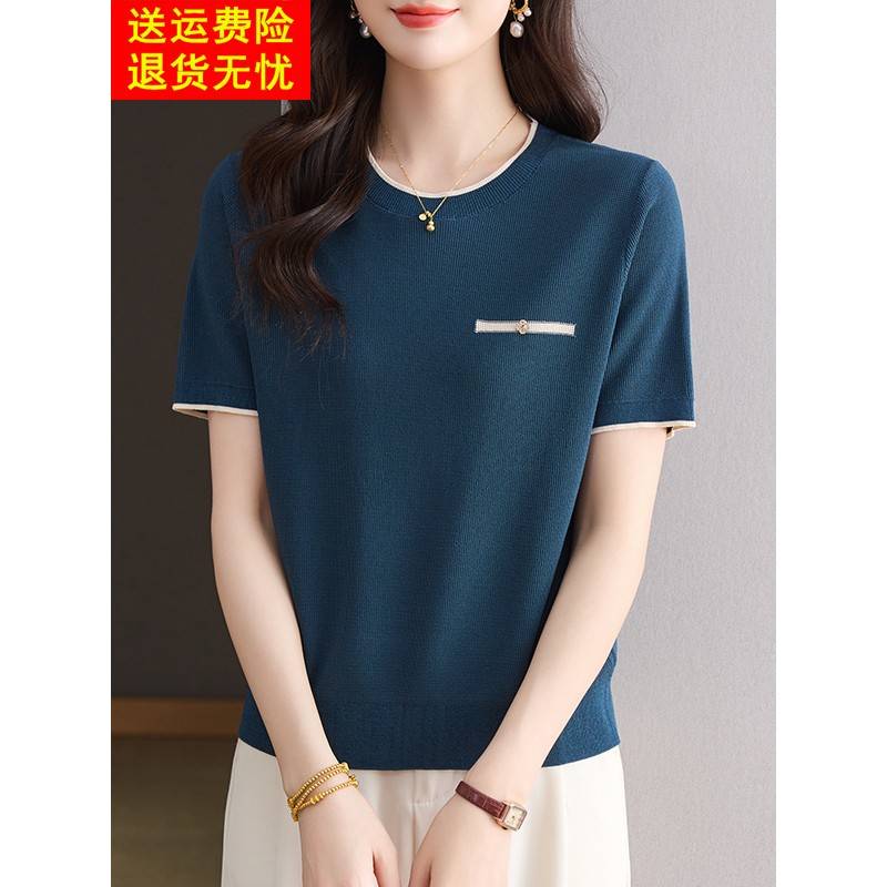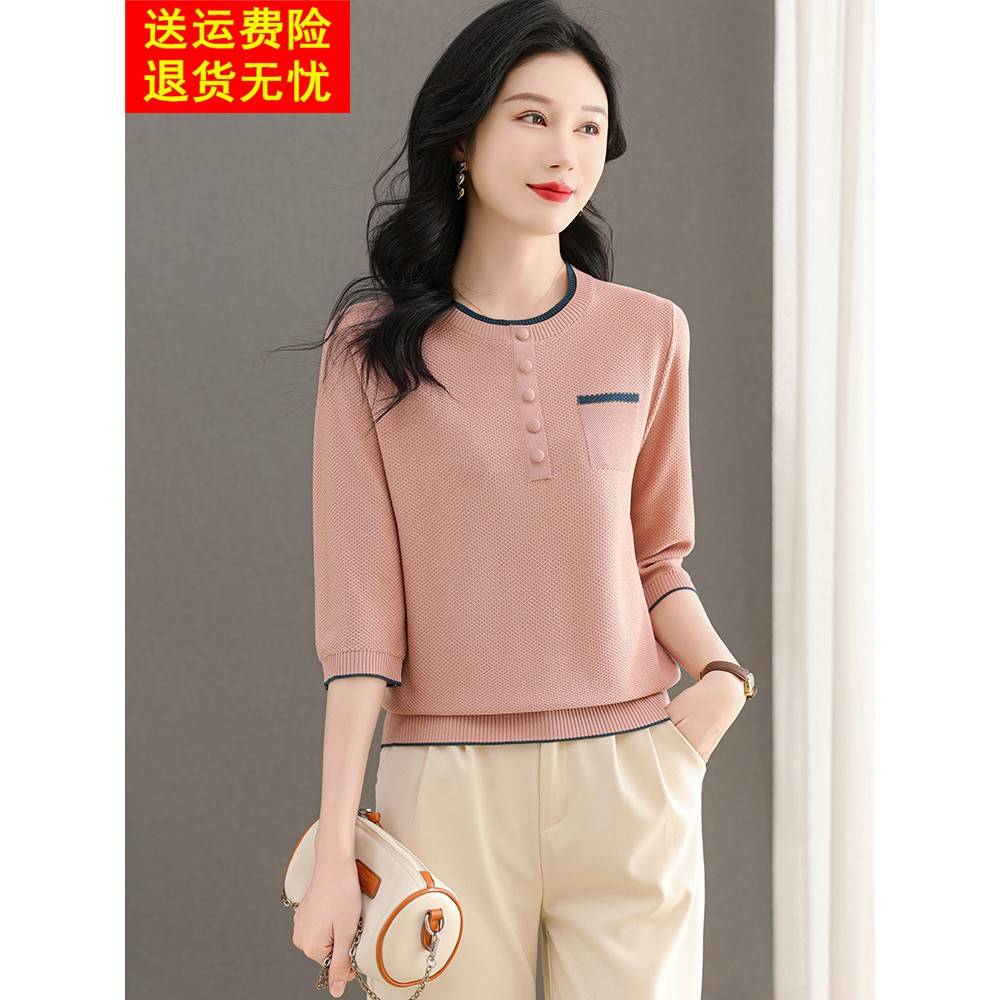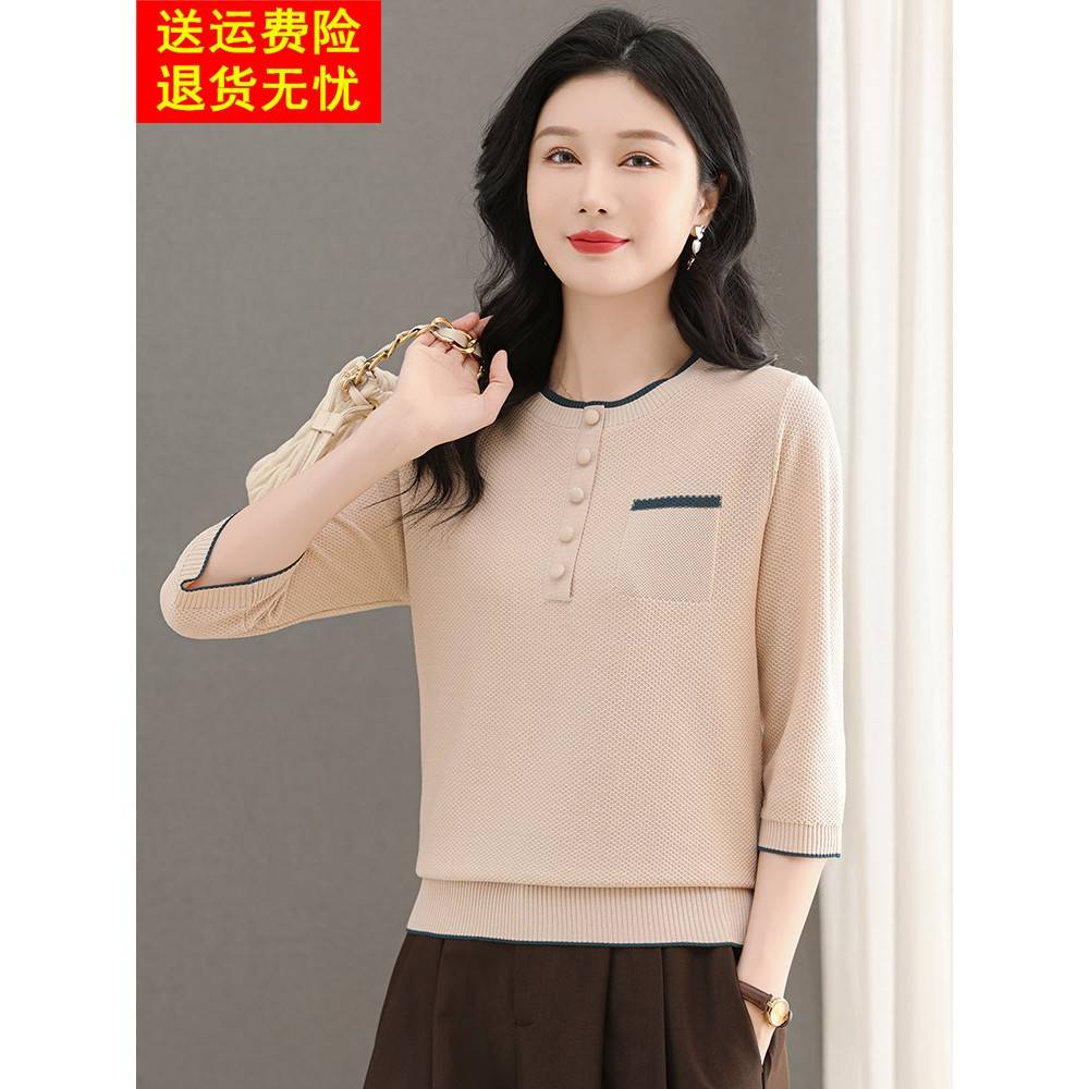 t恤冰丝打底小衫 七分袖 上衣妈妈夏装 女春秋薄款 圆领桑蚕丝针织衫