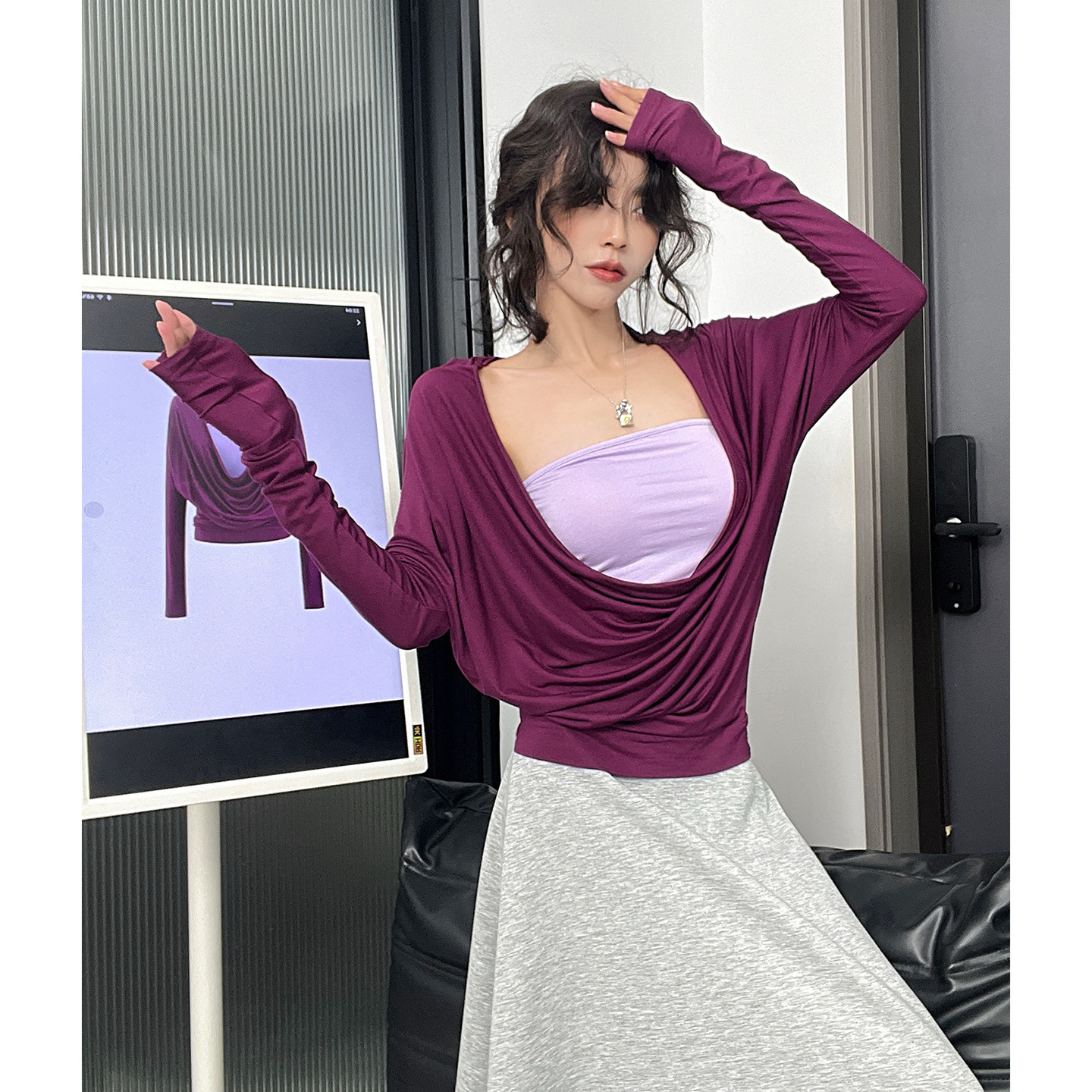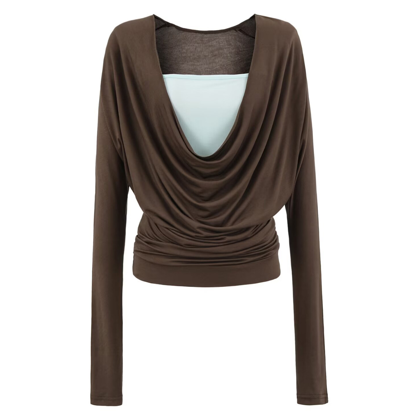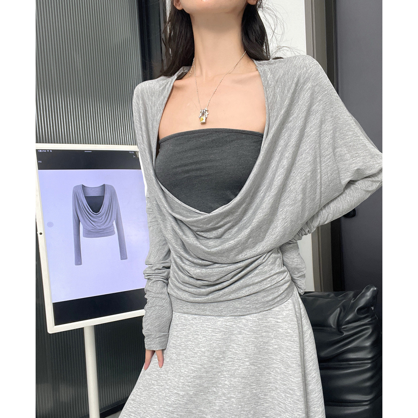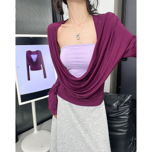 MianCun天丝荡领假两件上衣女蝙蝠袖 T恤 复古高级感拼接纯欲风长袖