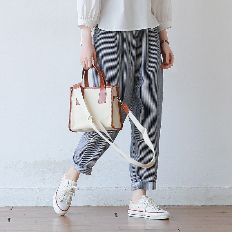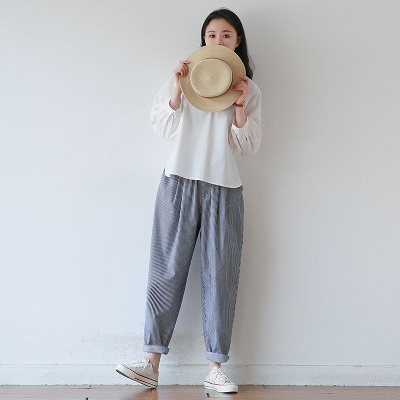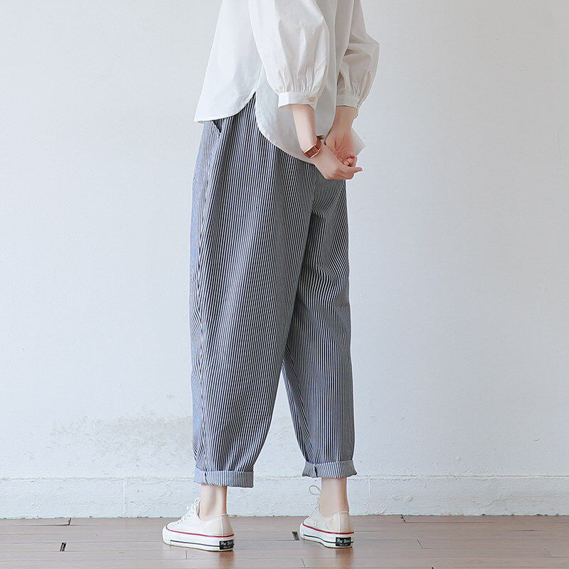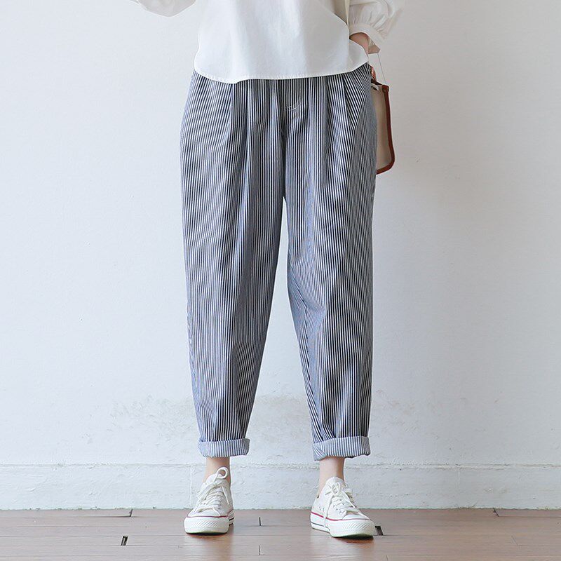 韩版 休闲老爹裤 文艺宽松大码 女式 子 条纹棉哈伦长裤 2025春夏新款