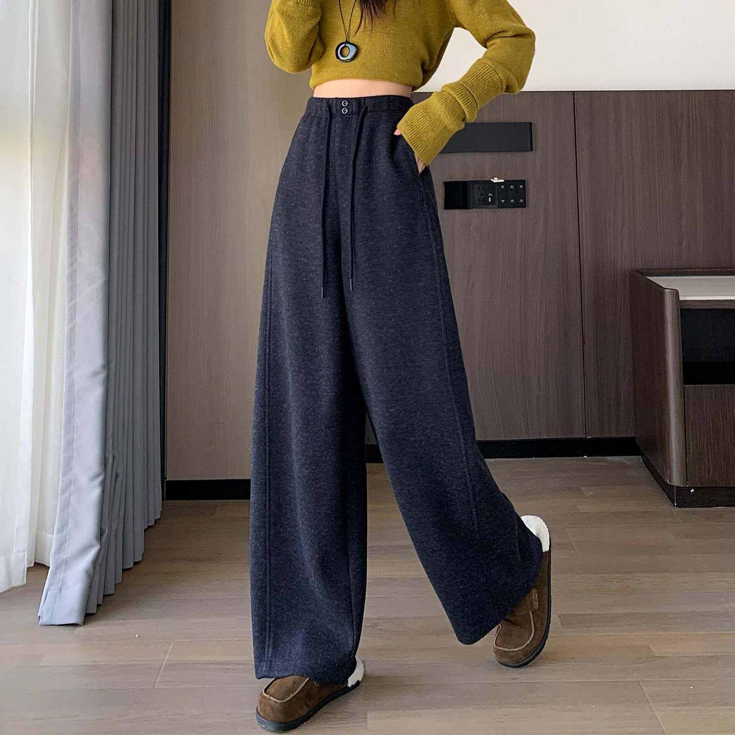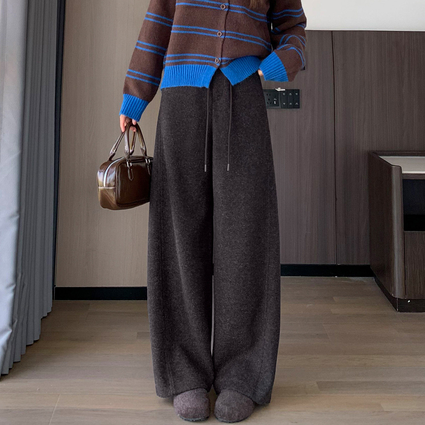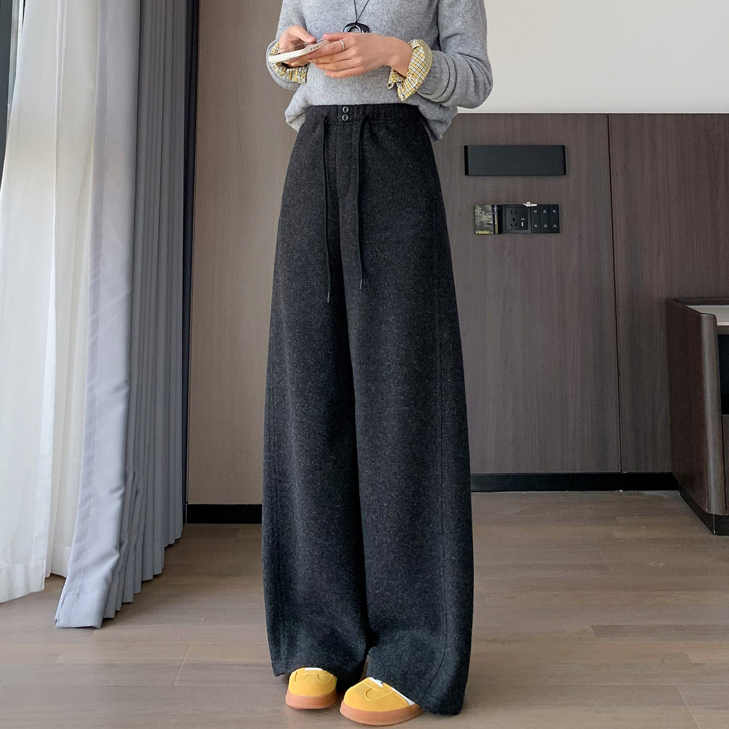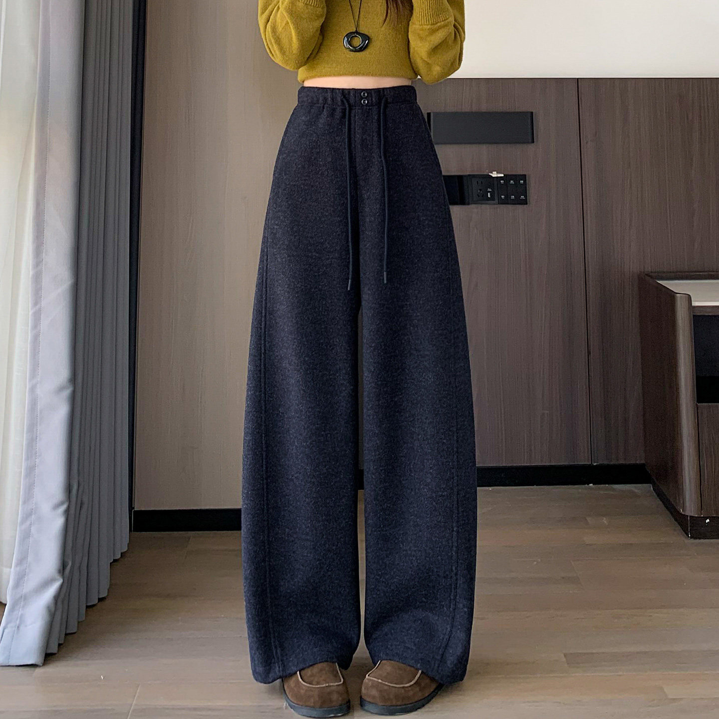 宽松休闲糯米香蕉裤 黑灰色毛呢弯刀阔腿裤 女秋冬加绒加厚2025新款