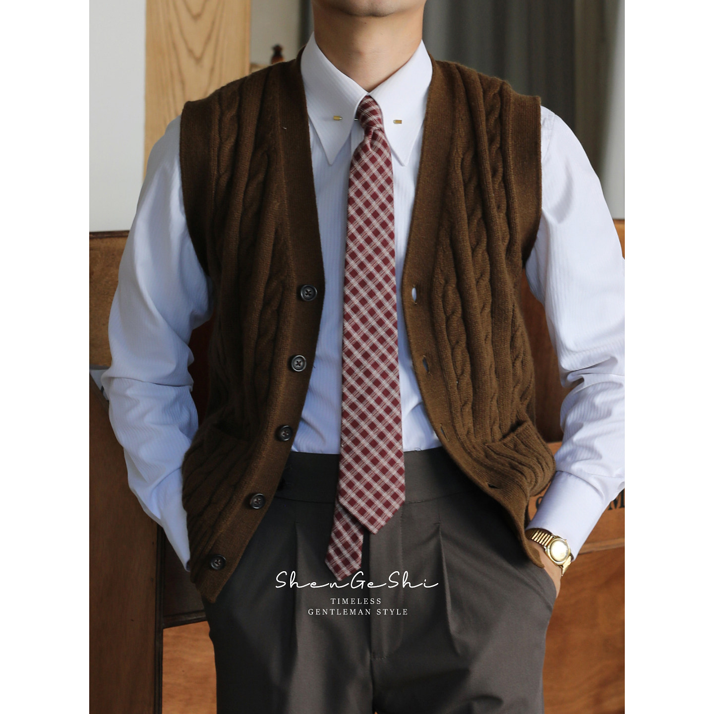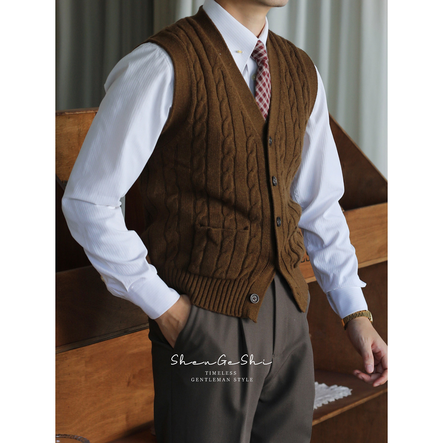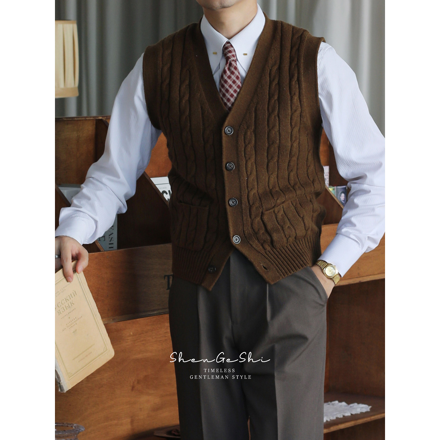 老钱风保暖打底针织衫 羊毛绞花毛衣马甲 背心 V领开衫 英伦复古修身