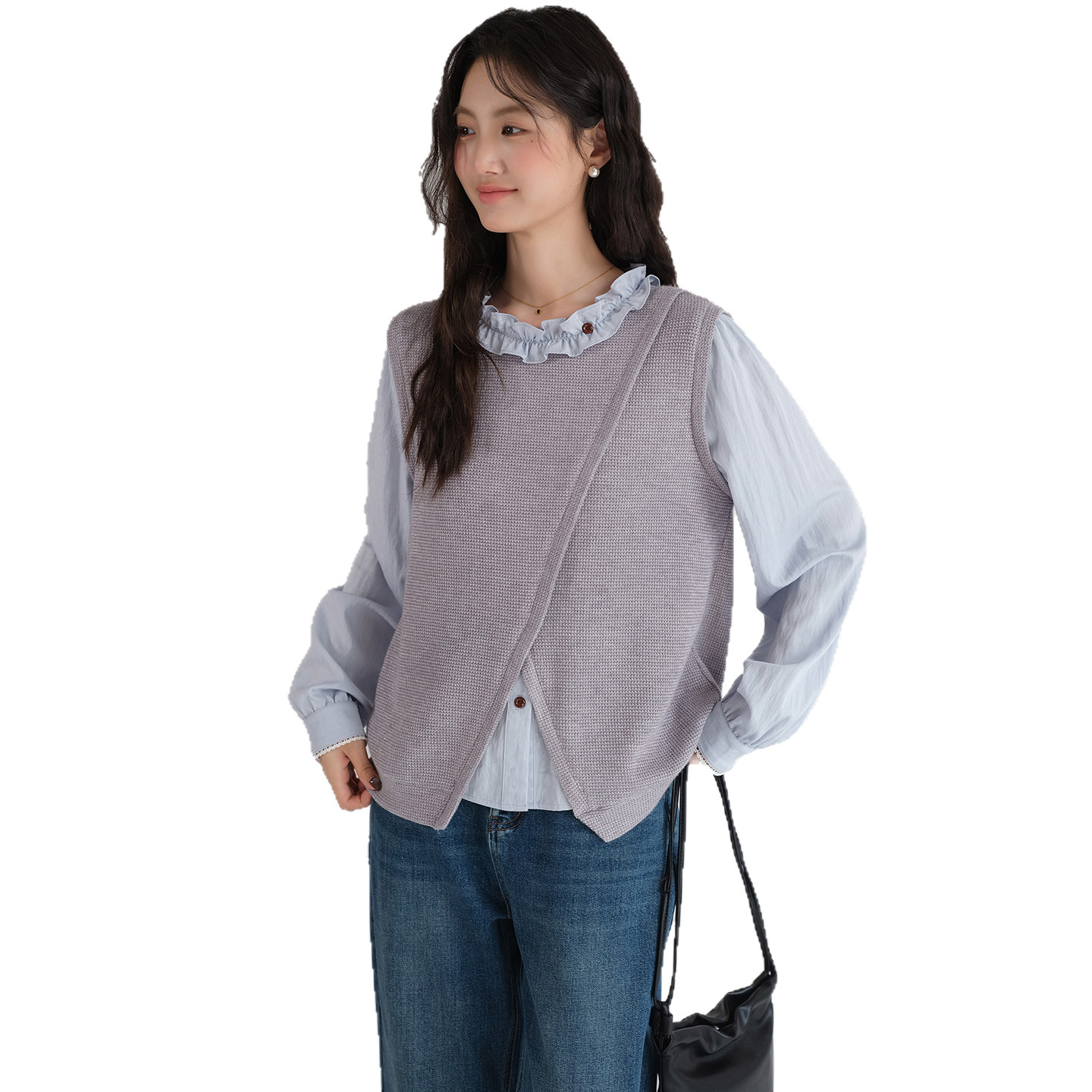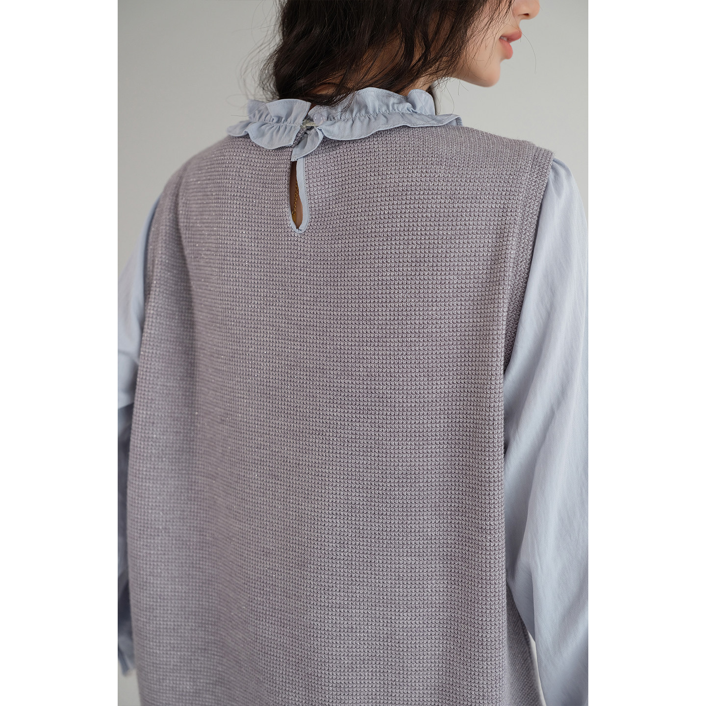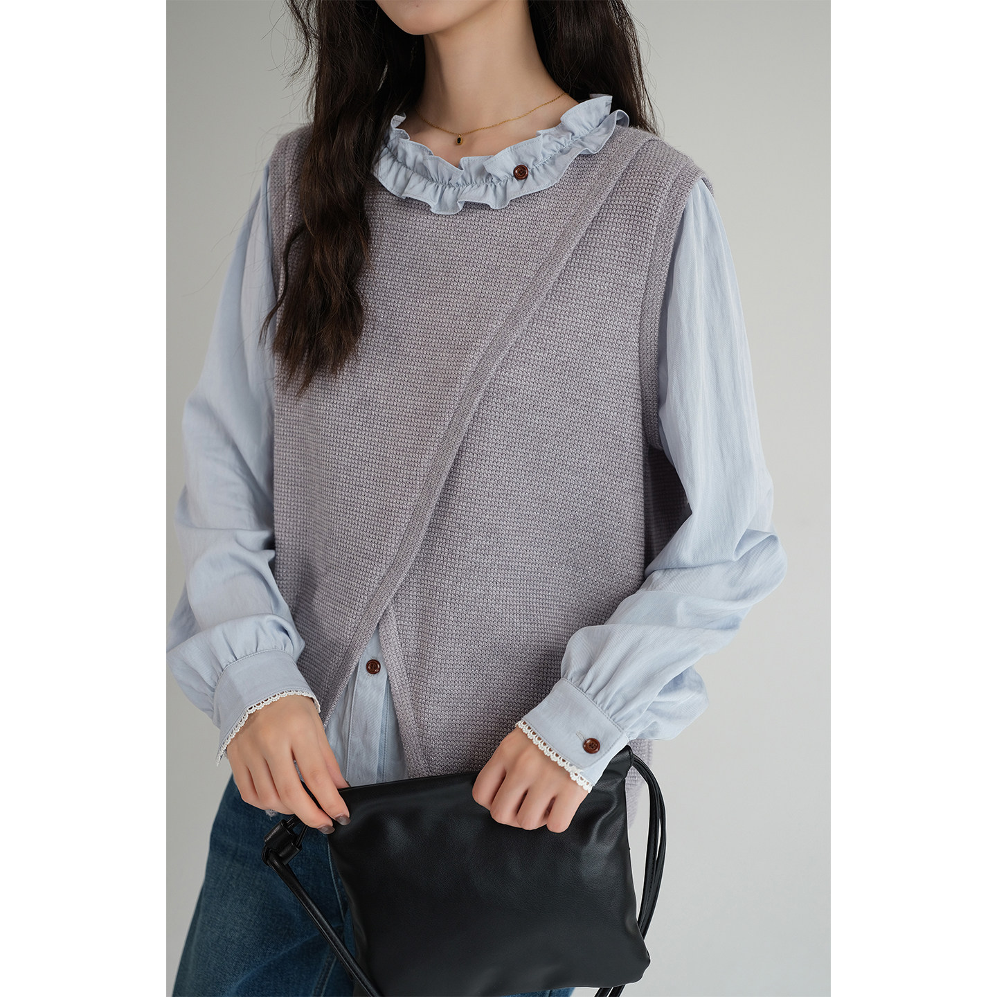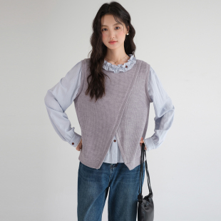 新款 2026春装 蓝若水大码 花边圆领上衣 针织马甲假两件叠穿衬衫