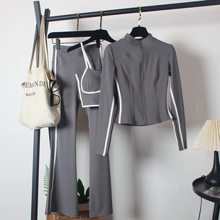 显瘦舞蹈晨跑步紧身拉链三件套 高腰喇叭裤 瑜伽服运动套装 女秋冬款