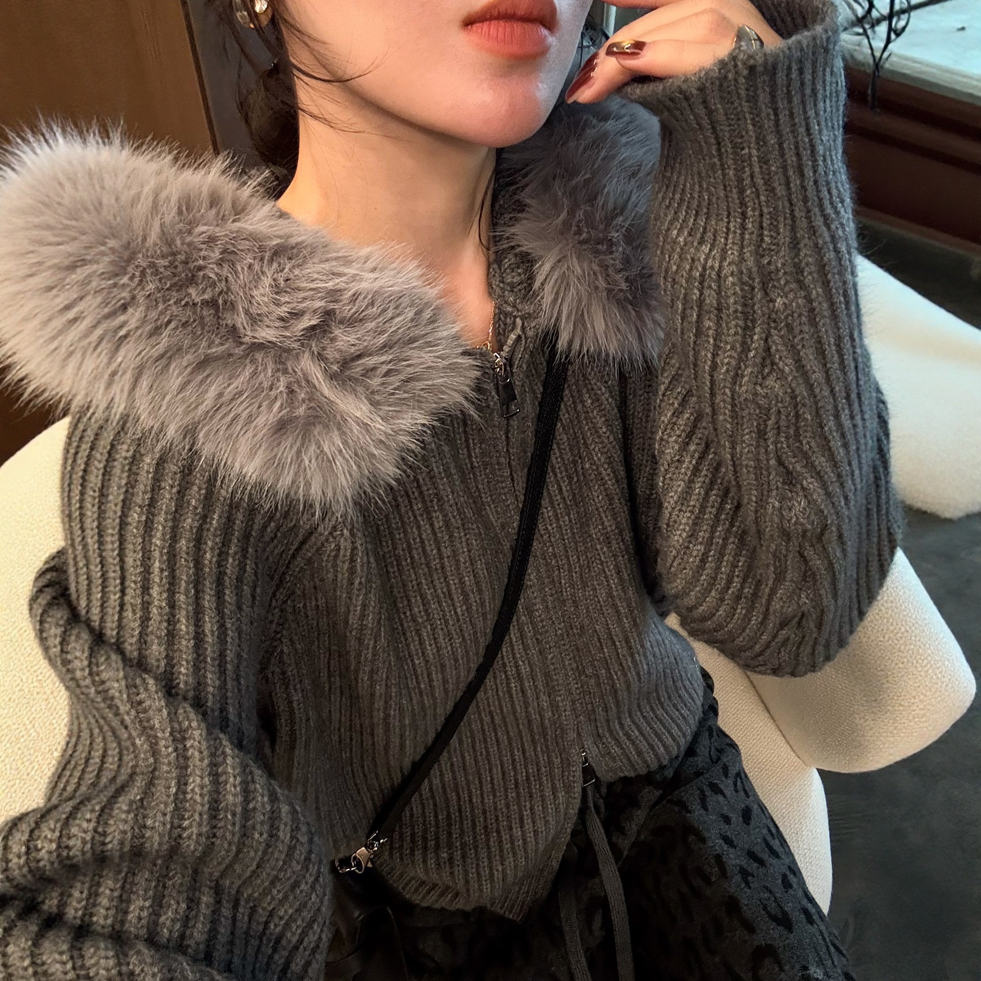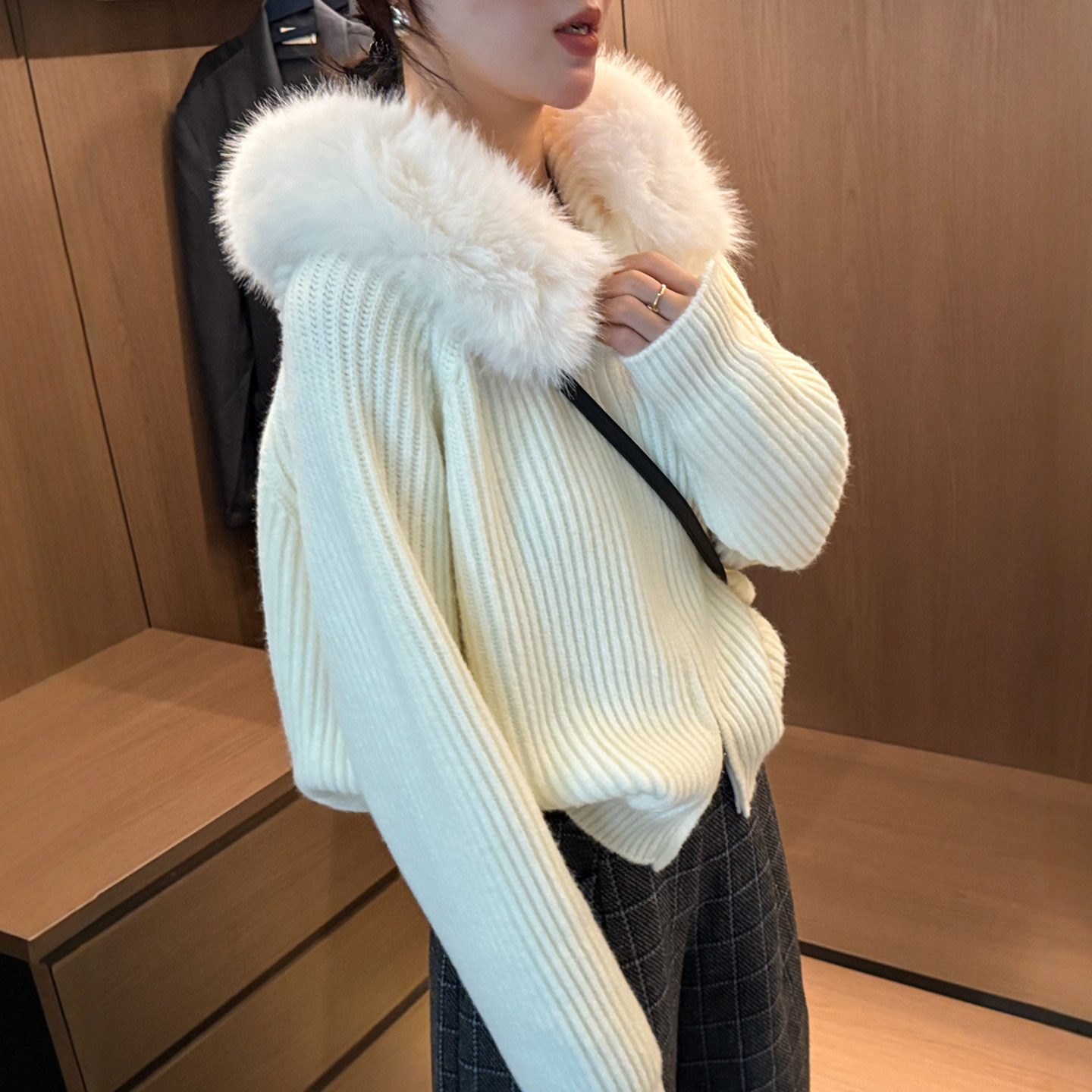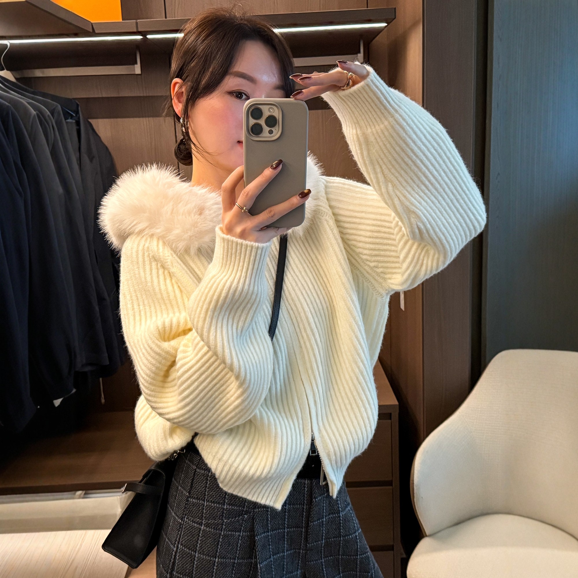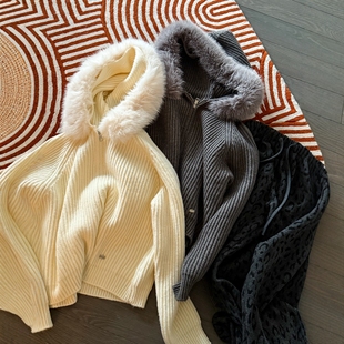 欧货女装 新款 短外套潮 女欧洲站2025冬装 贴标毛领连帽羊毛针织开衫
