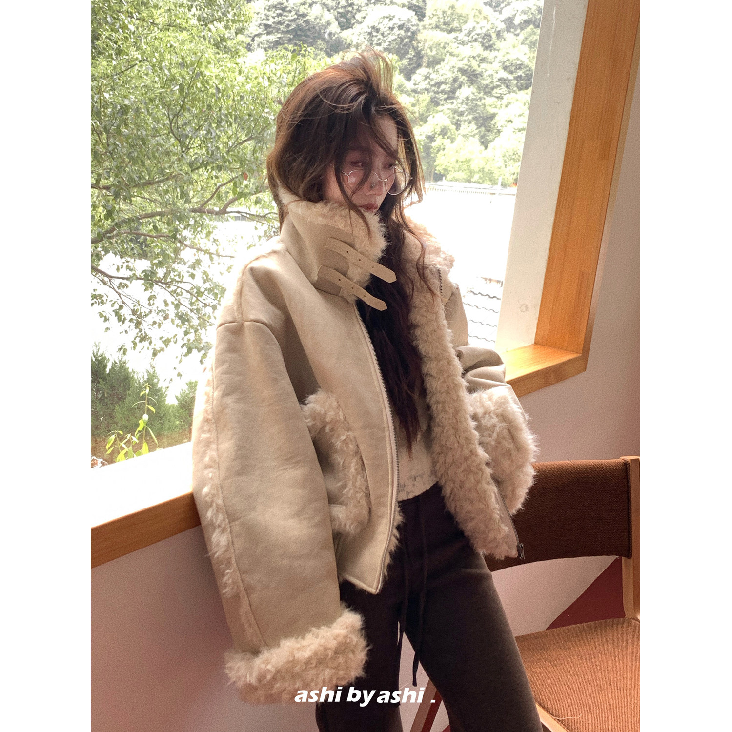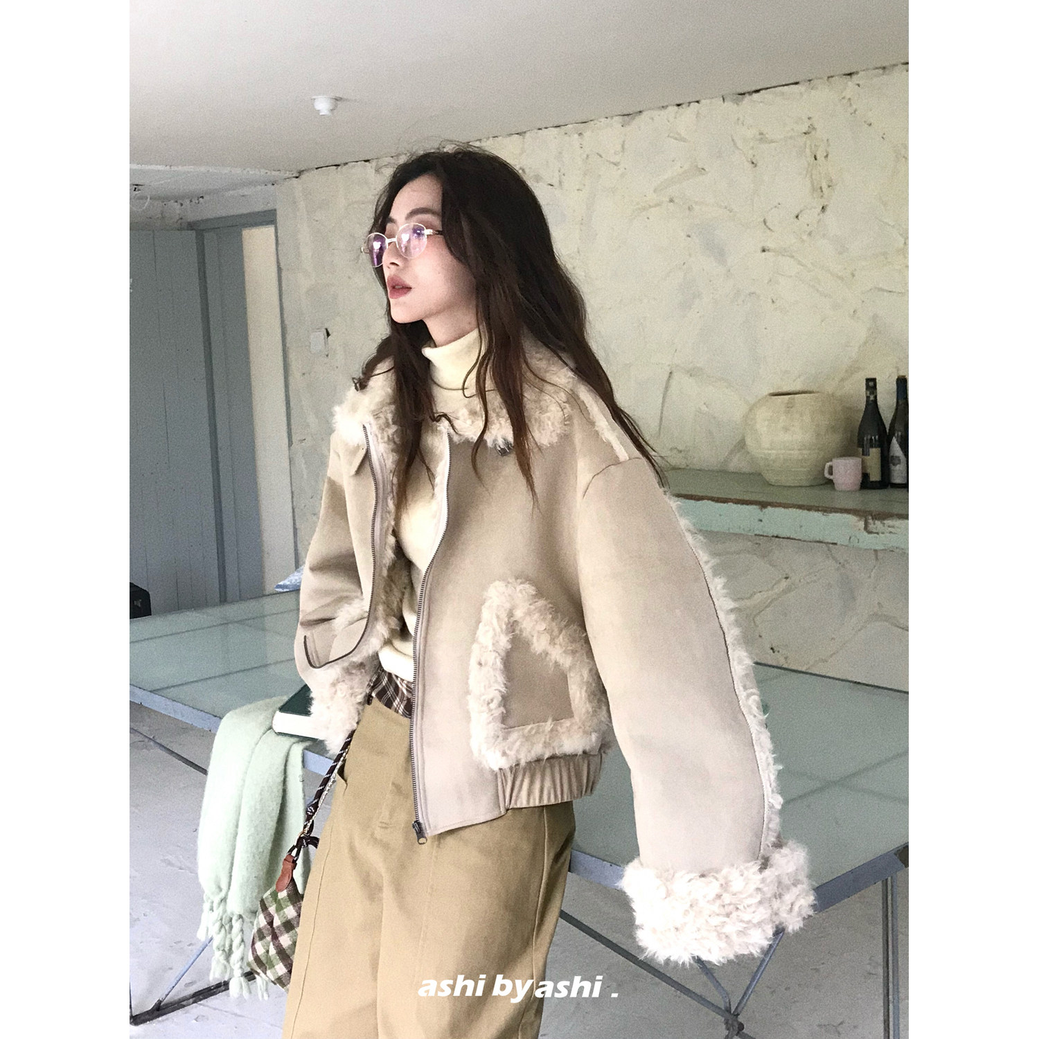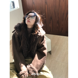 大于诗集 仿皮草皮毛一体拼接机车夹克女宽松加厚外套冬 巴斯奶兔