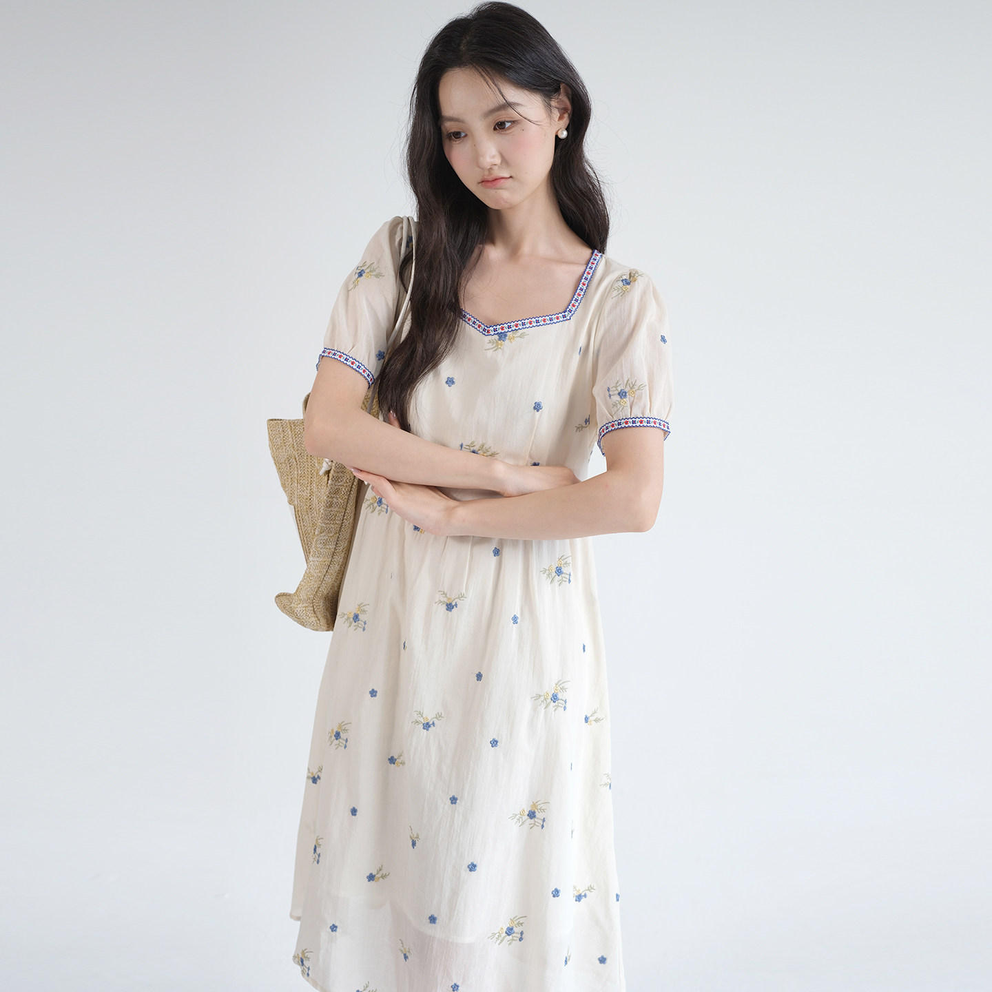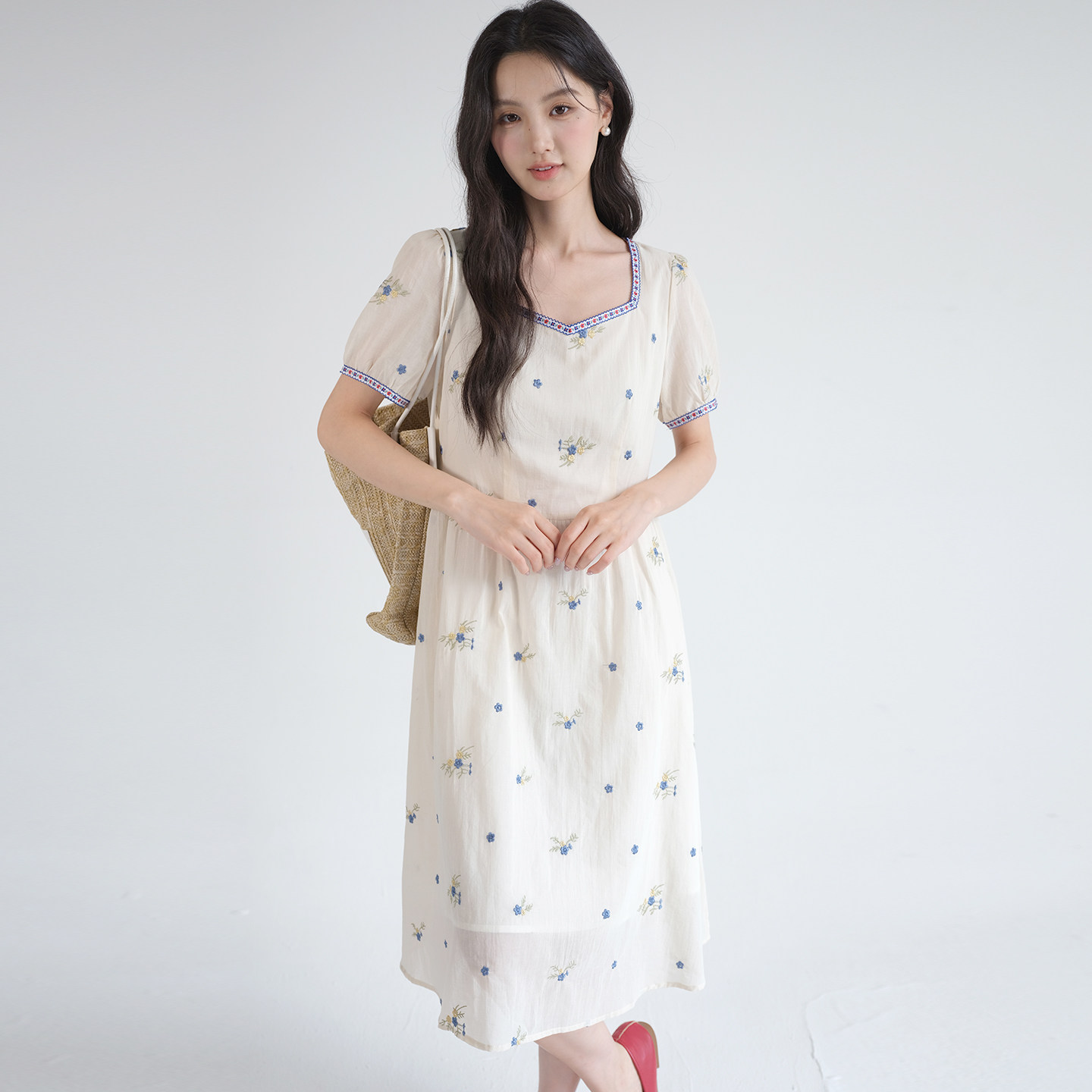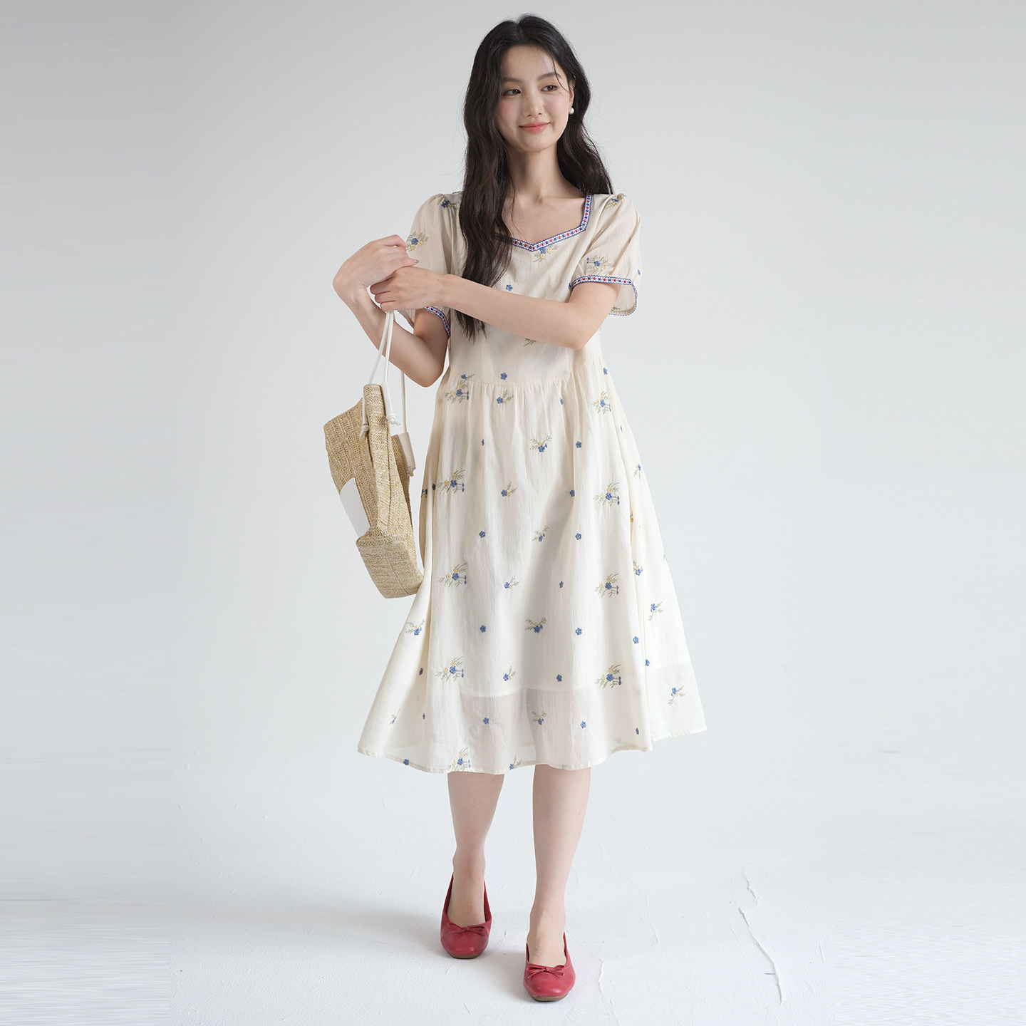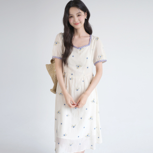 新款 2026夏装 刺绣方领碎花裙胖MM梨形身材连衣裙YL 女装 蓝若水大码