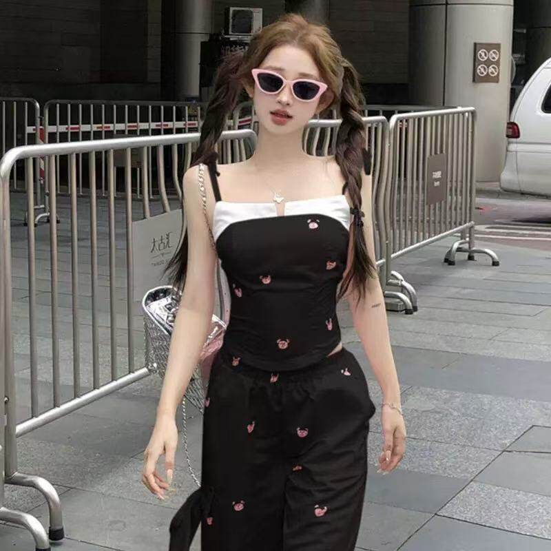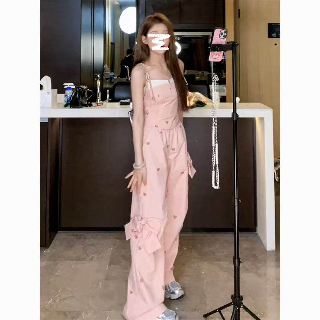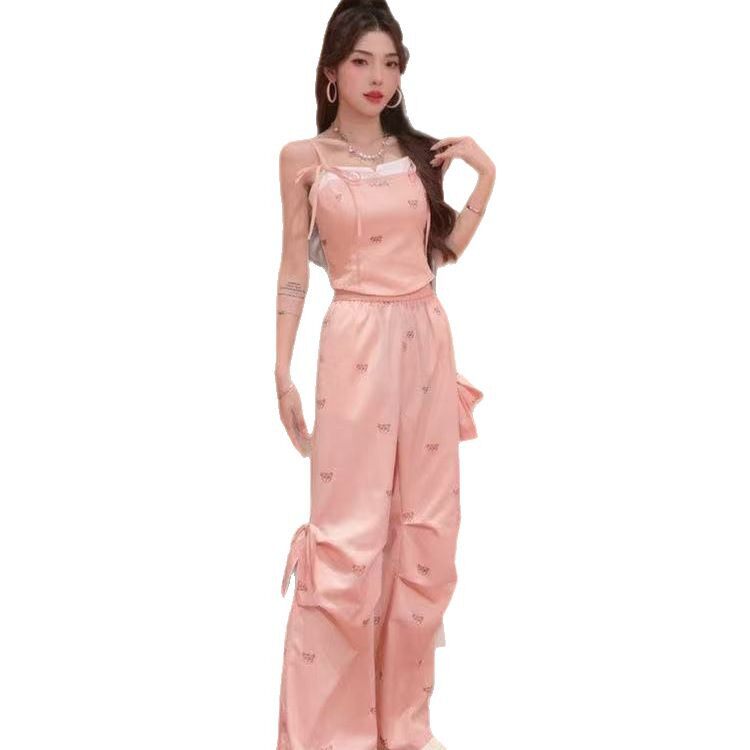 粉色新款 女蝴蝶结吊带背心高级设计直筒裤 两件套 套装 炸街甜酷夏季