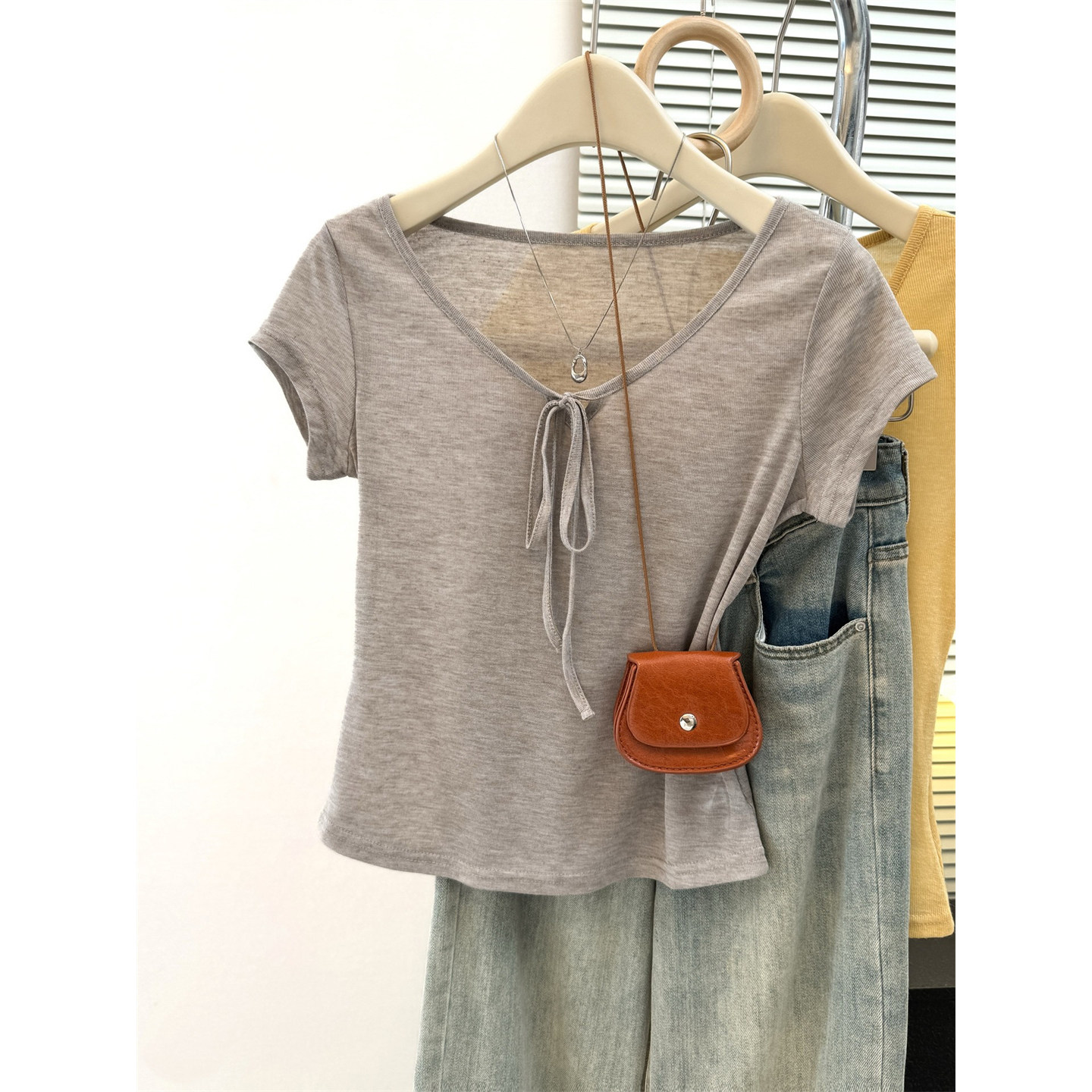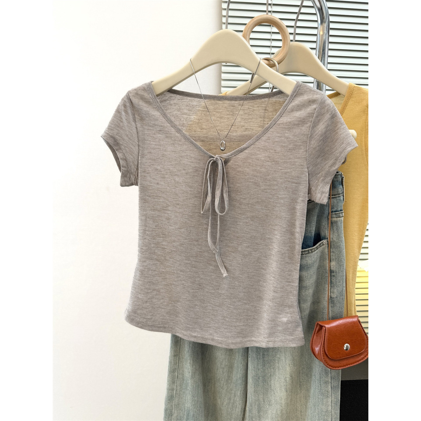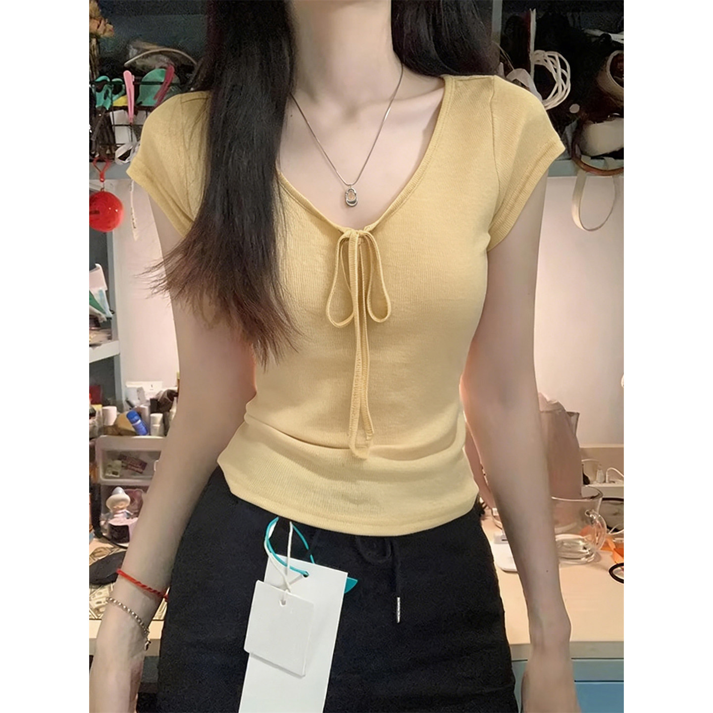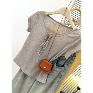 设计感小众绑带V领薄款 小个子短款 修身 T恤女夏季 上衣服潮 正肩短袖