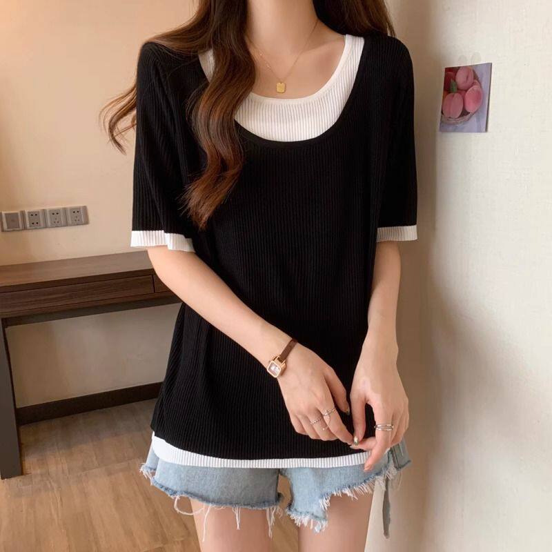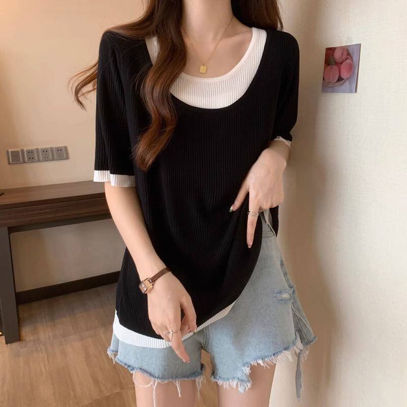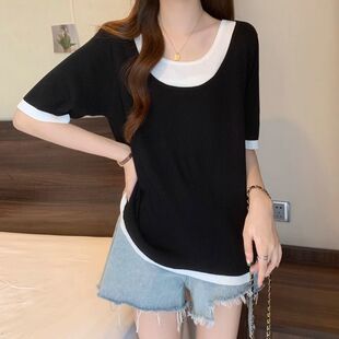 新小众别致拼接宽松假两件显瘦上衣 t恤女2026年夏季 大码 圆领短袖