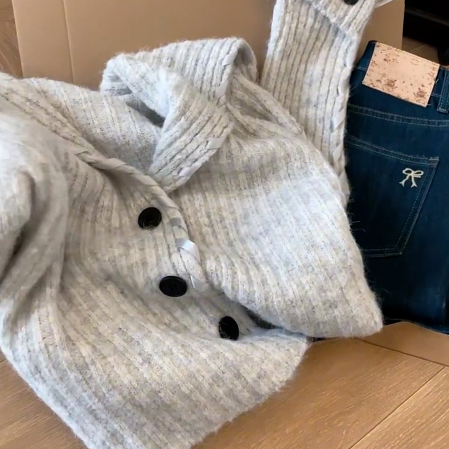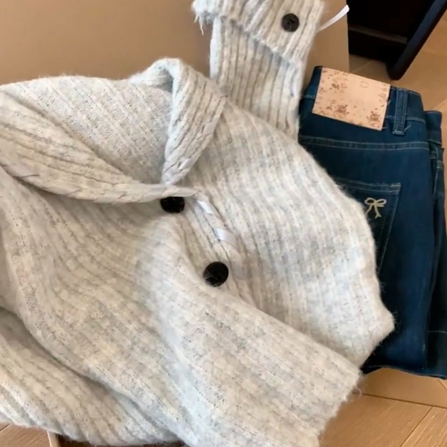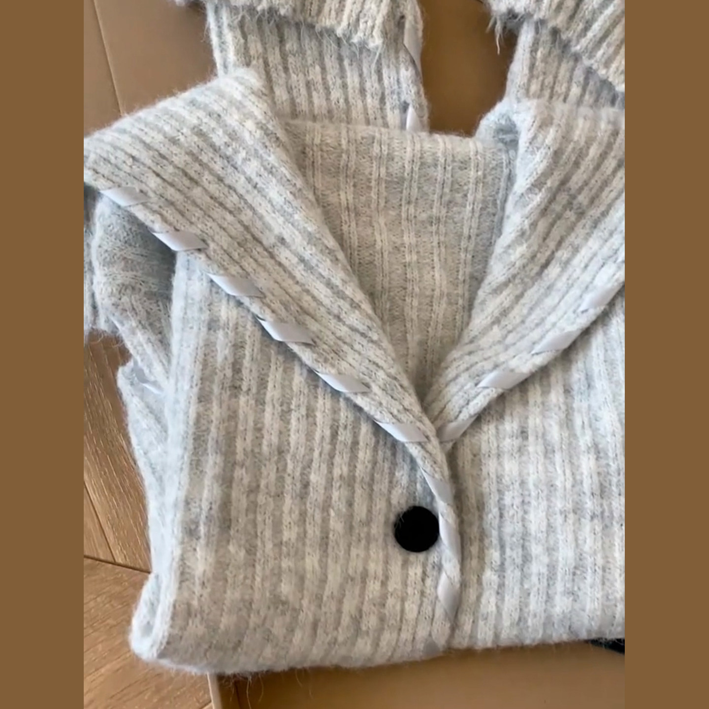 早秋韩系氛围感穿搭灰色大翻领毛边毛衣外套女秋冬慵懒风针织开衫