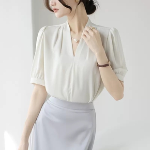 法式 气质小众短袖 新款 女2026夏季 缎面垂感通勤职业上衣 衬衫