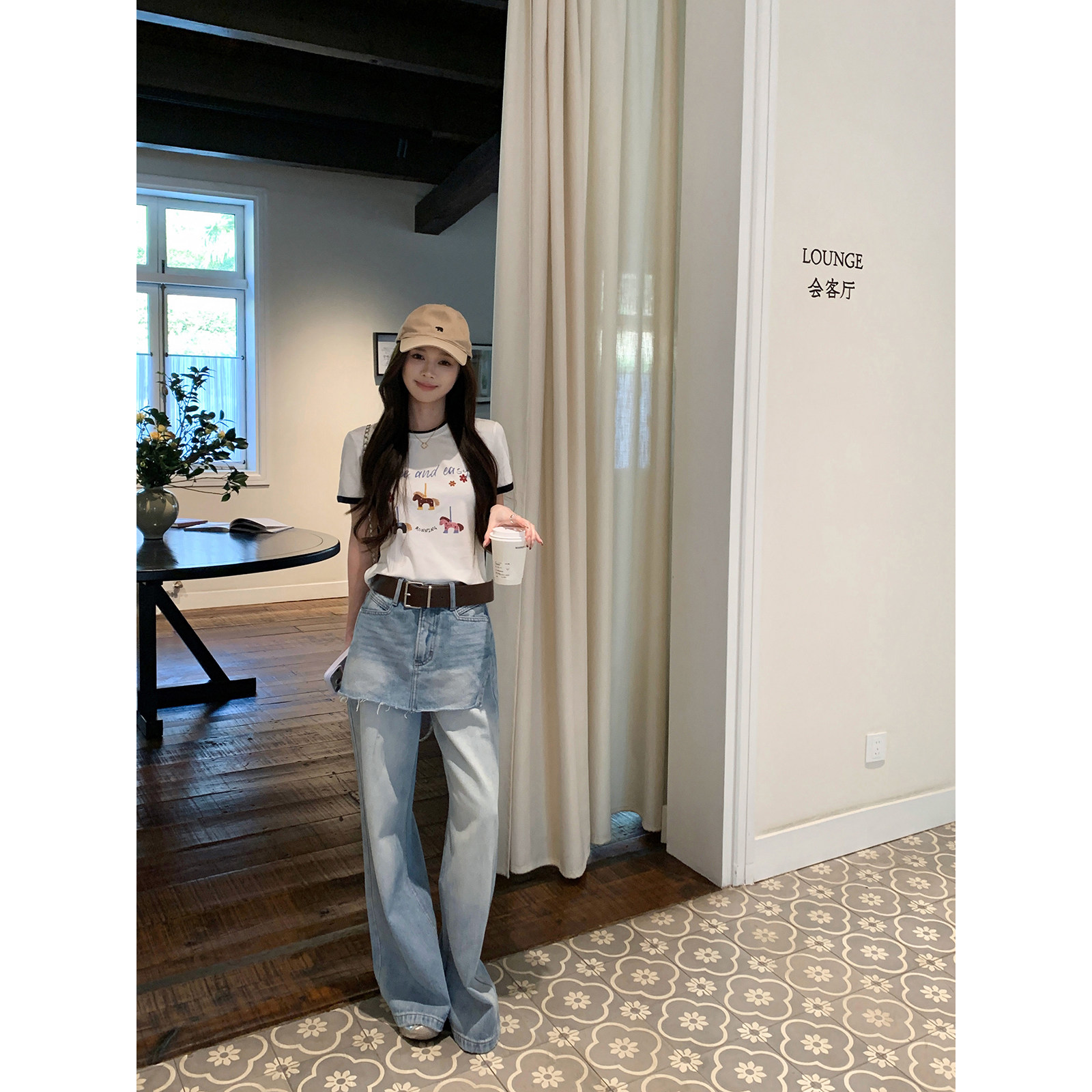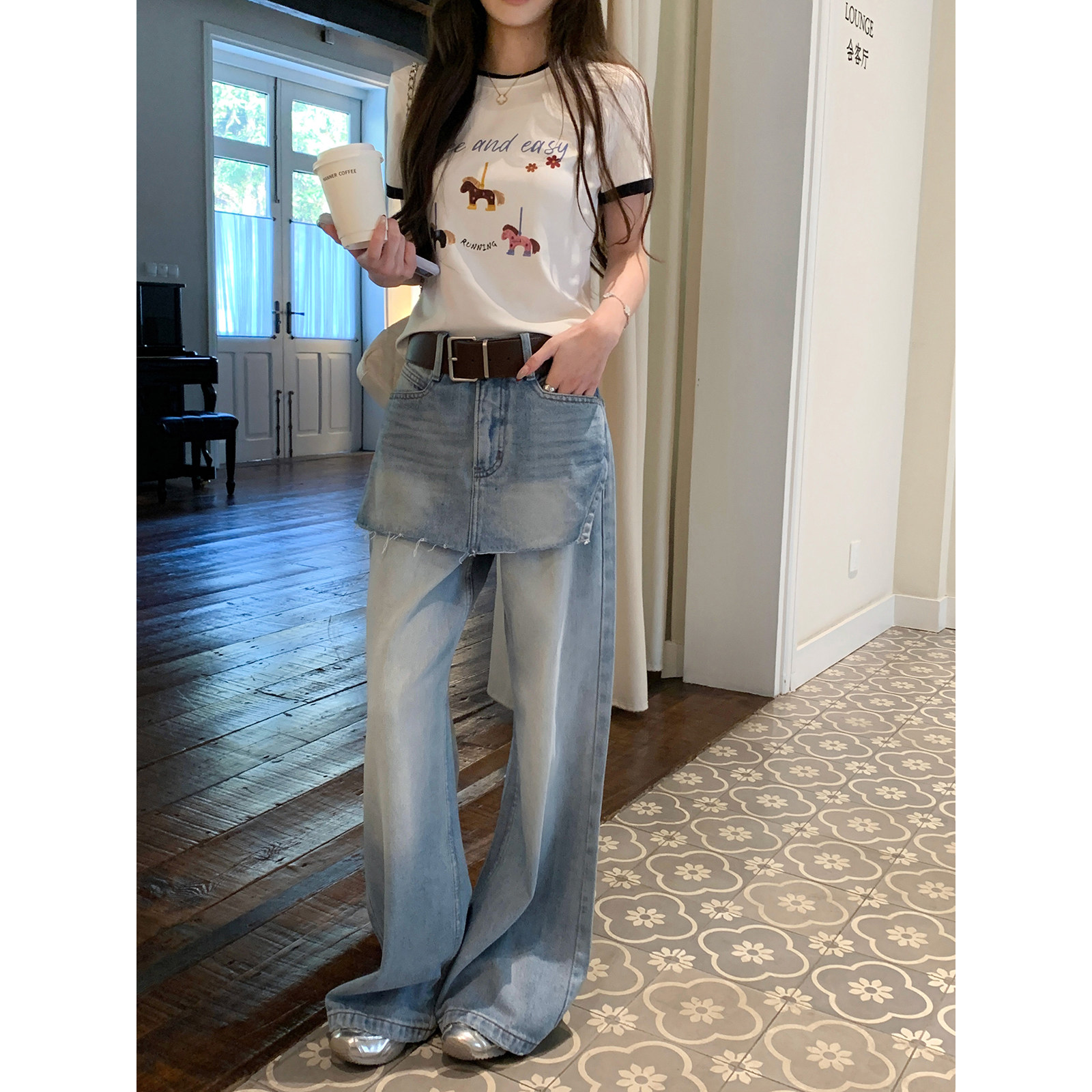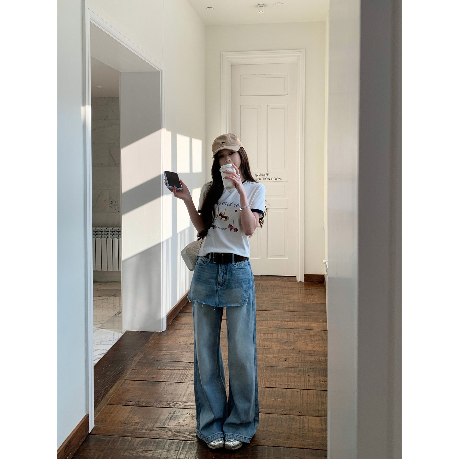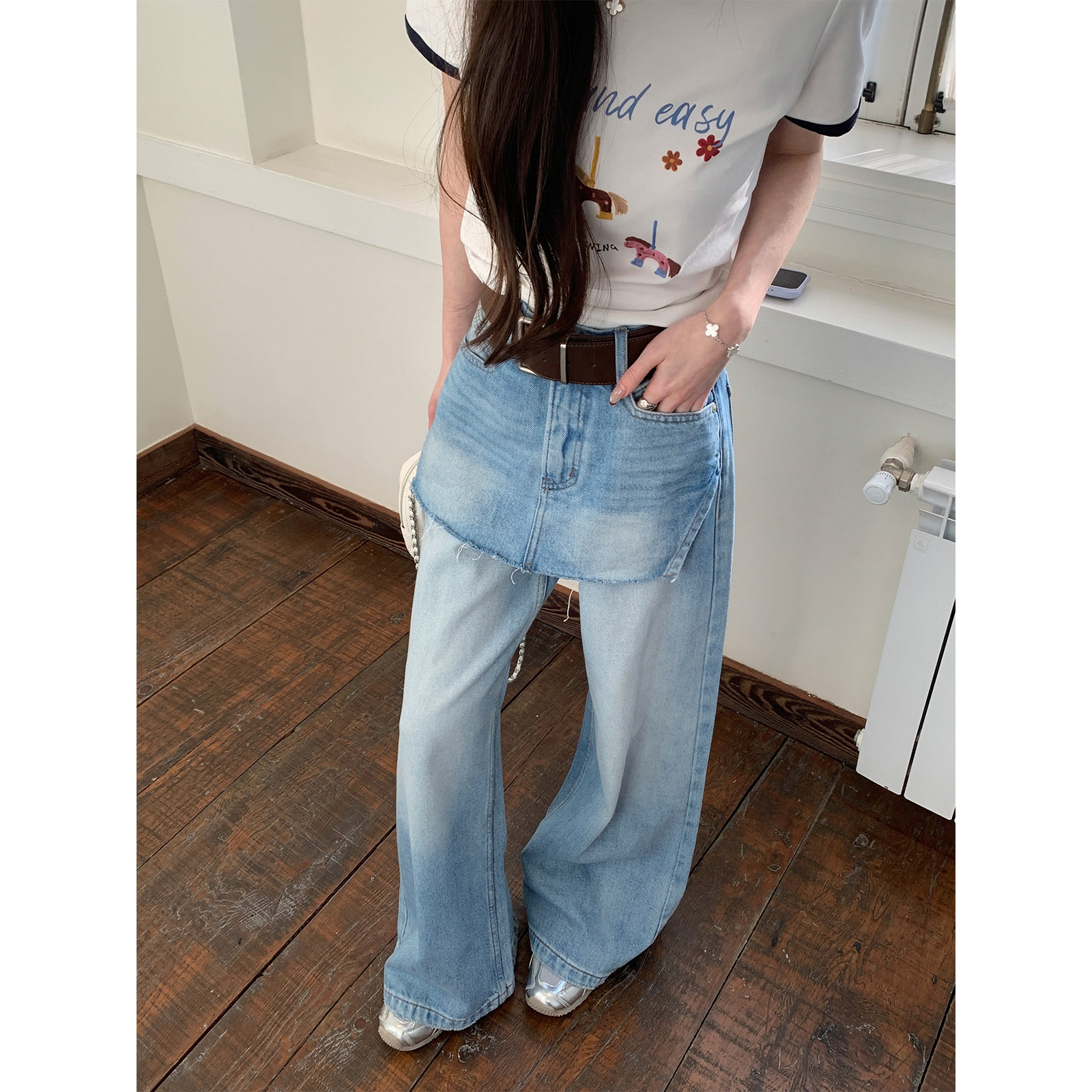 水洗做旧休闲裤 MG小象 女春季 浅色假两件叠穿牛仔裤 自在时髦日常