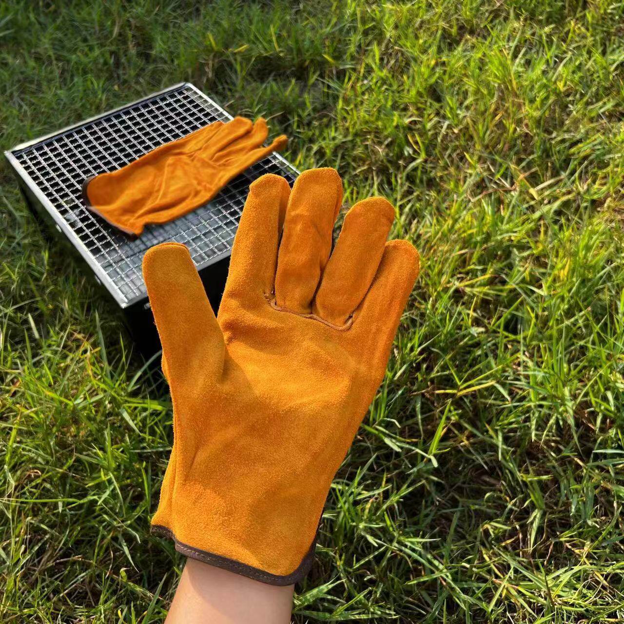 户外野营日本牛皮加厚隔热手套户外烧烤生火手套耐磨防烫露营手套