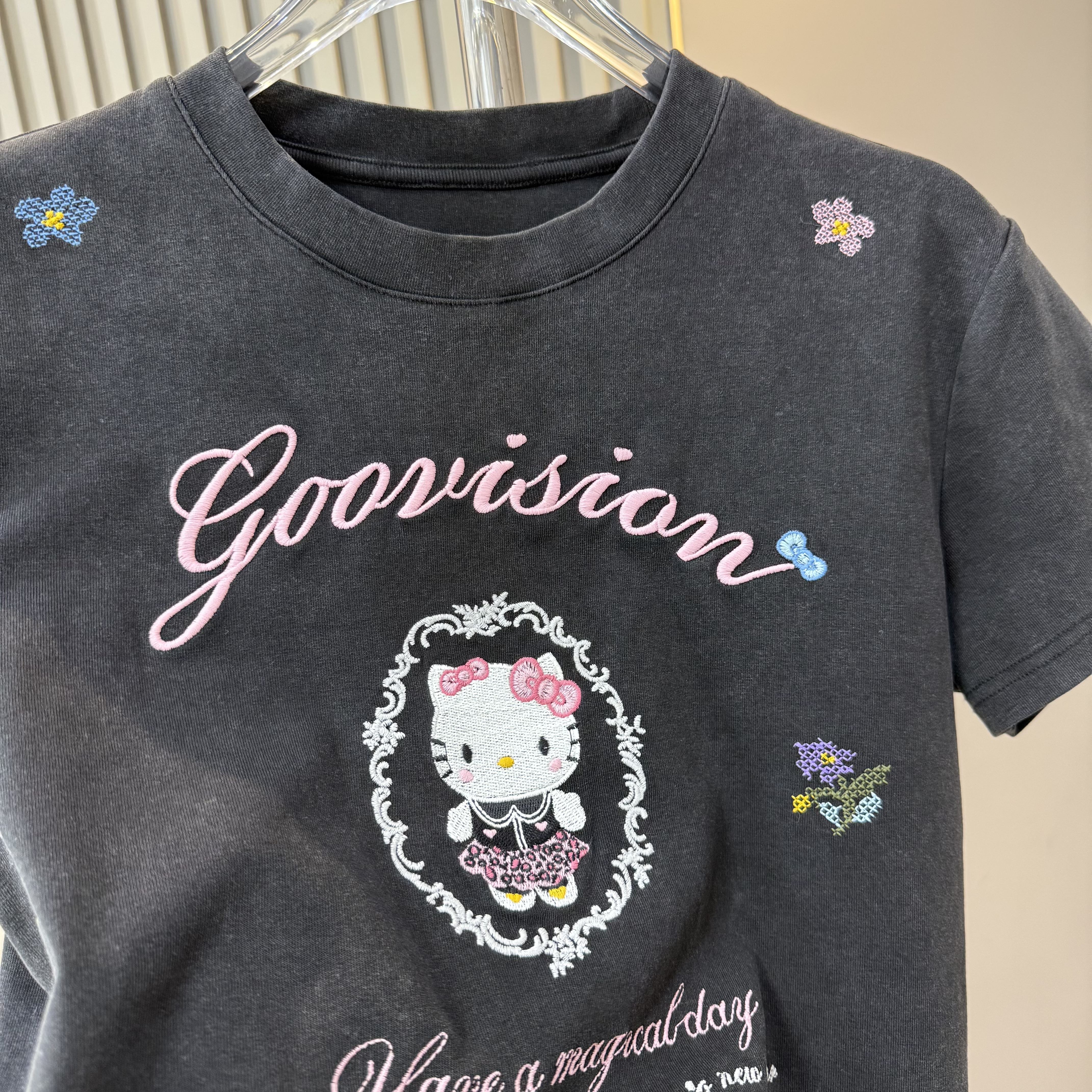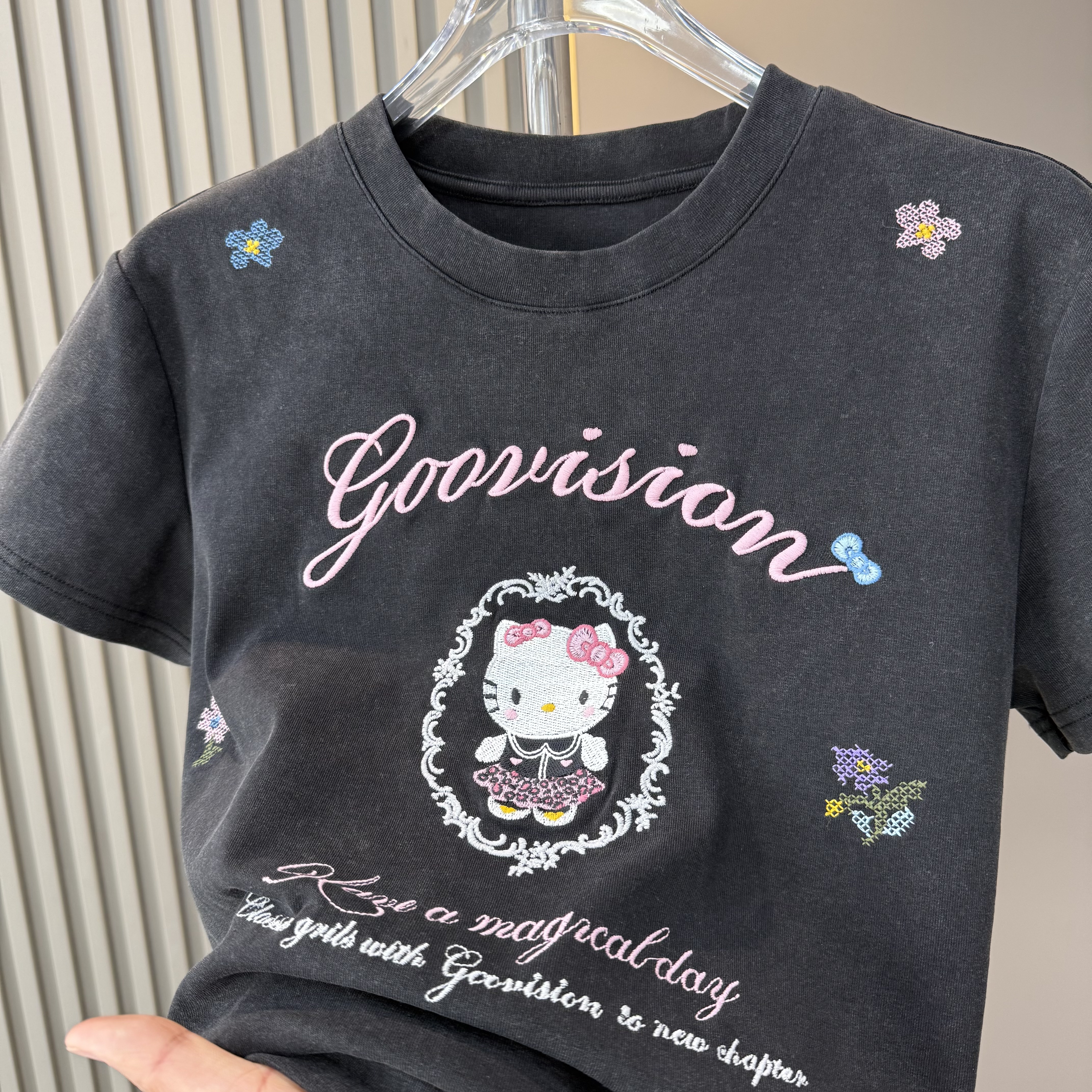 夏季 欧货2026夏新款 T恤女 卡通猫咪刺绣短袖 做旧上衣 甜美可爱