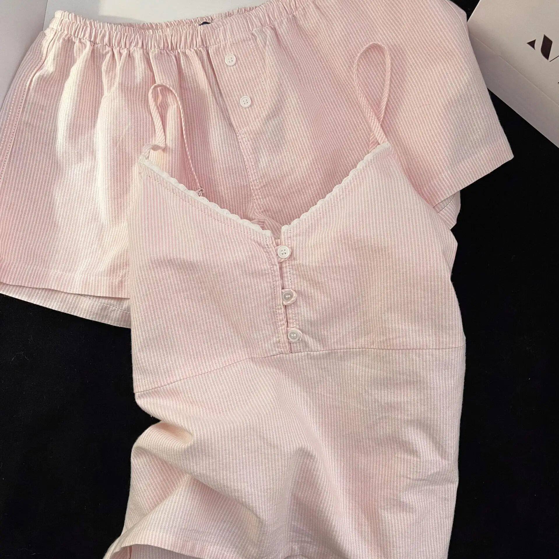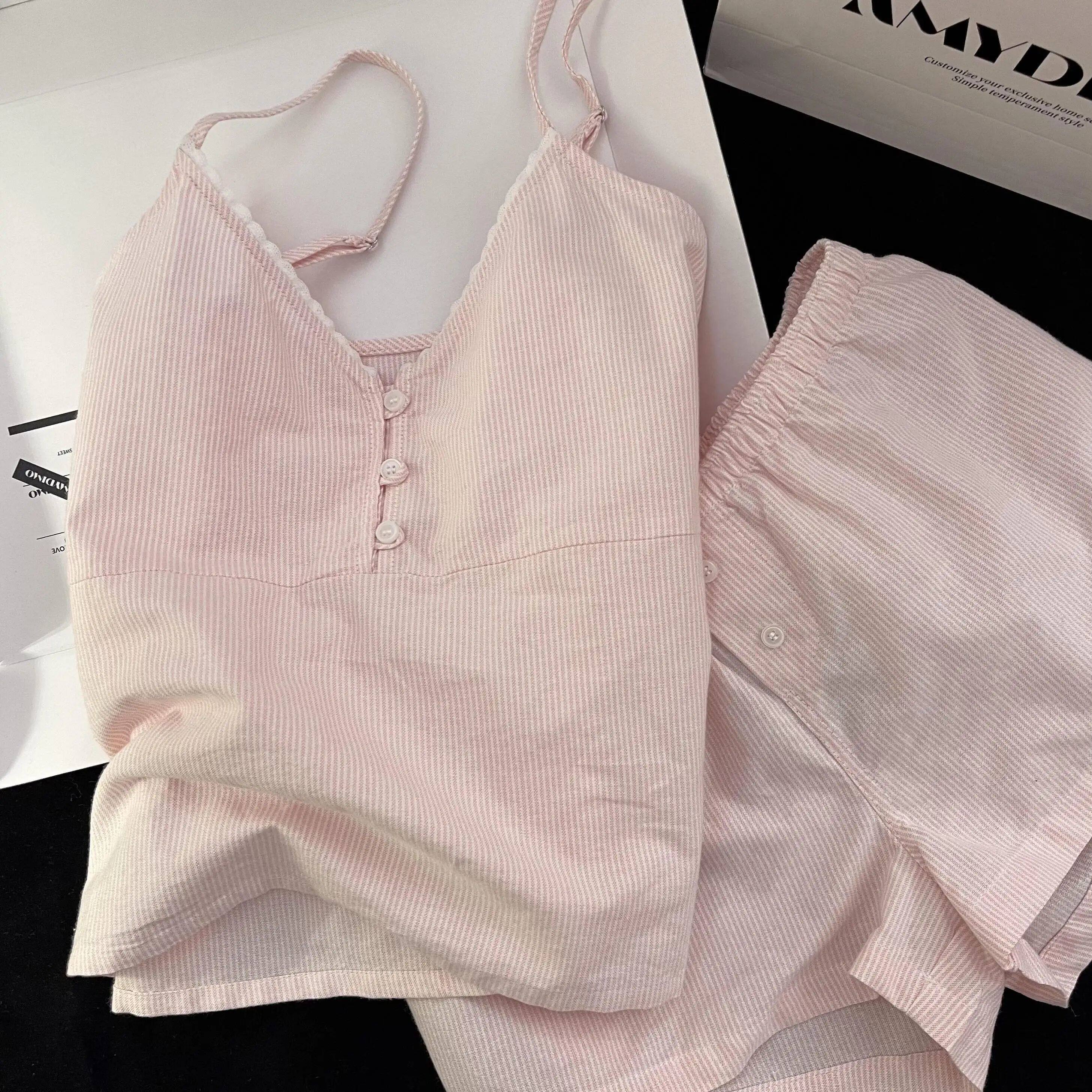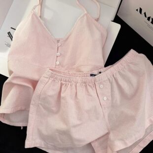 Women Fit Slim Summer Sleepwear Strap Neck Stripe Sweet