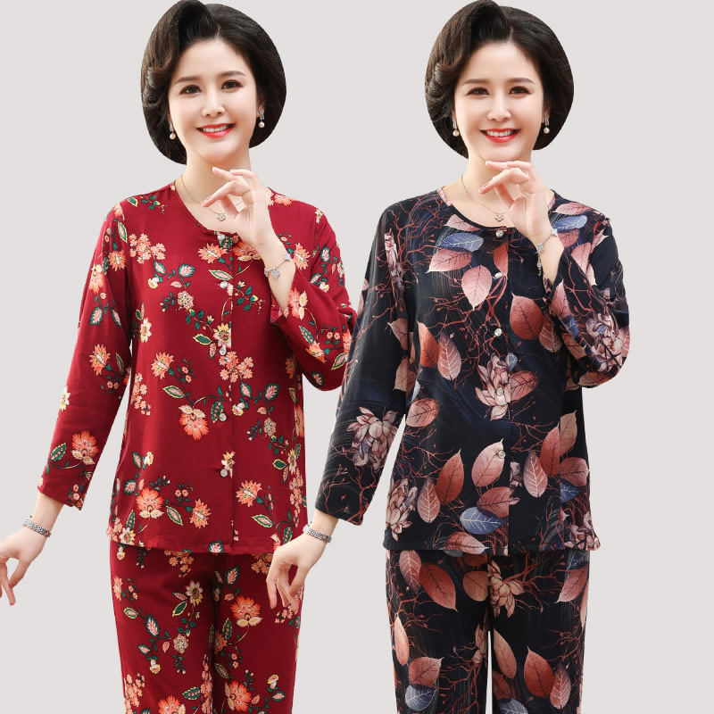 夏季 妈妈加肥加大睡衣棉绸长袖 凉感开衫 居家服套装 大码 春秋款 女装