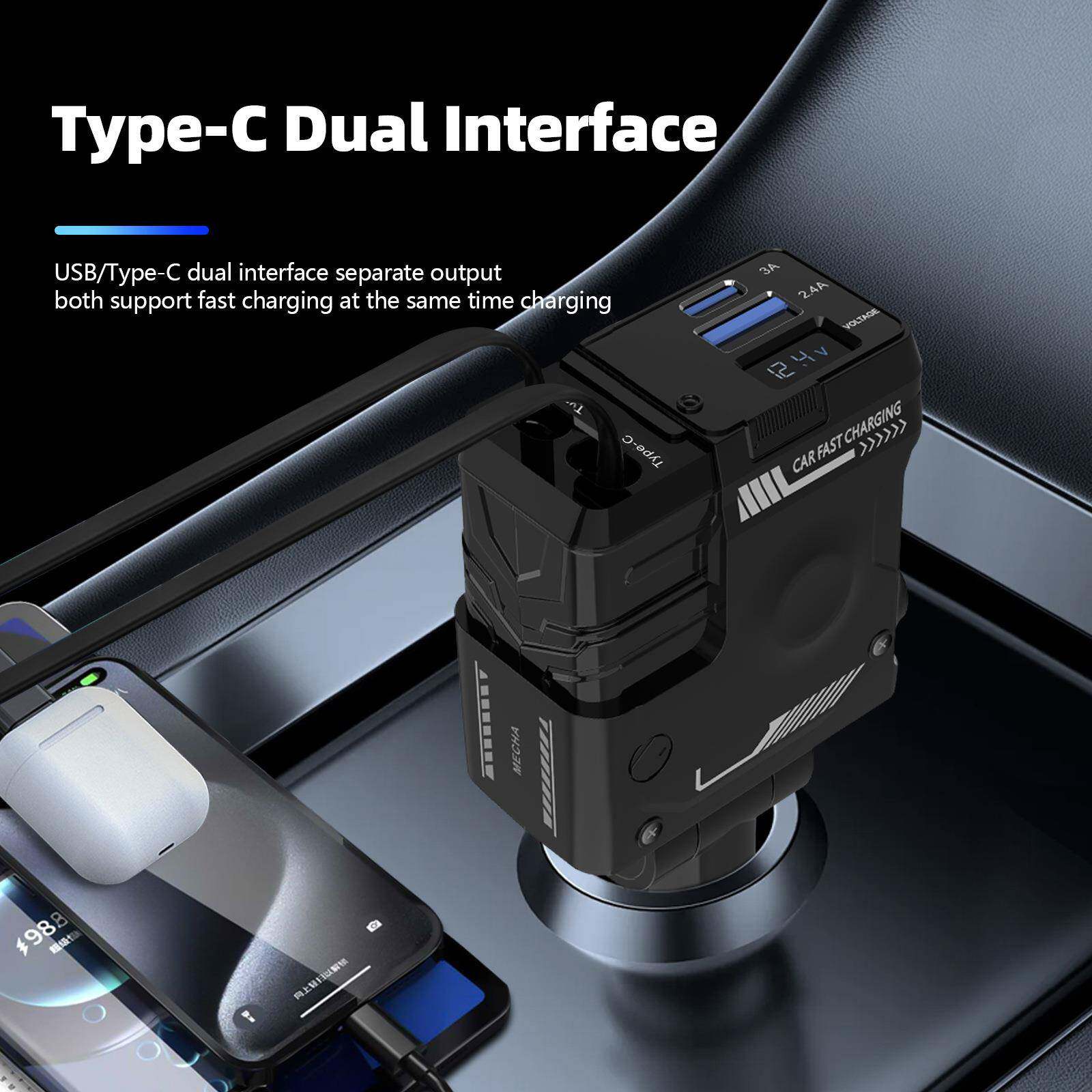 跨境汽车车载充电器支持66W超级快充闪充伸缩线四合一点烟器