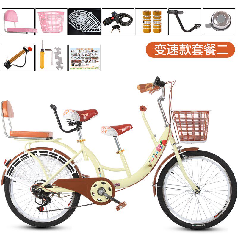 新款 自行车带小孩宝24寸女士双人淑女车 变速亲子车母子车22寸女式