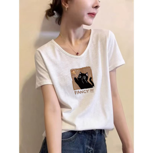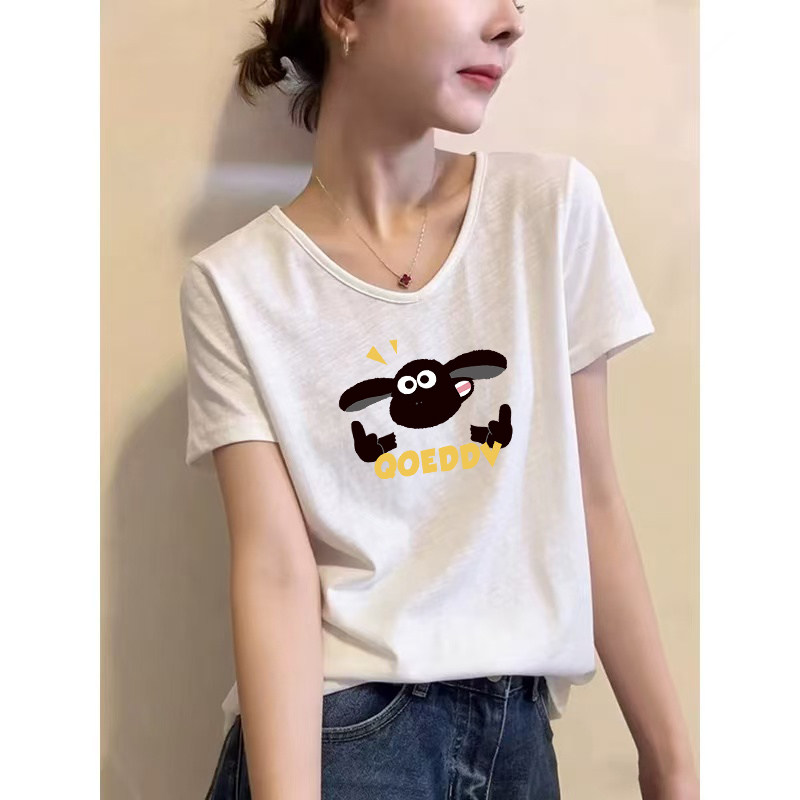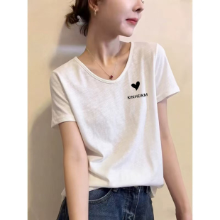 新款 纯棉女装 竹节棉v领短袖 洋气休闲印花大码 上衣 t恤韩版 2026夏季