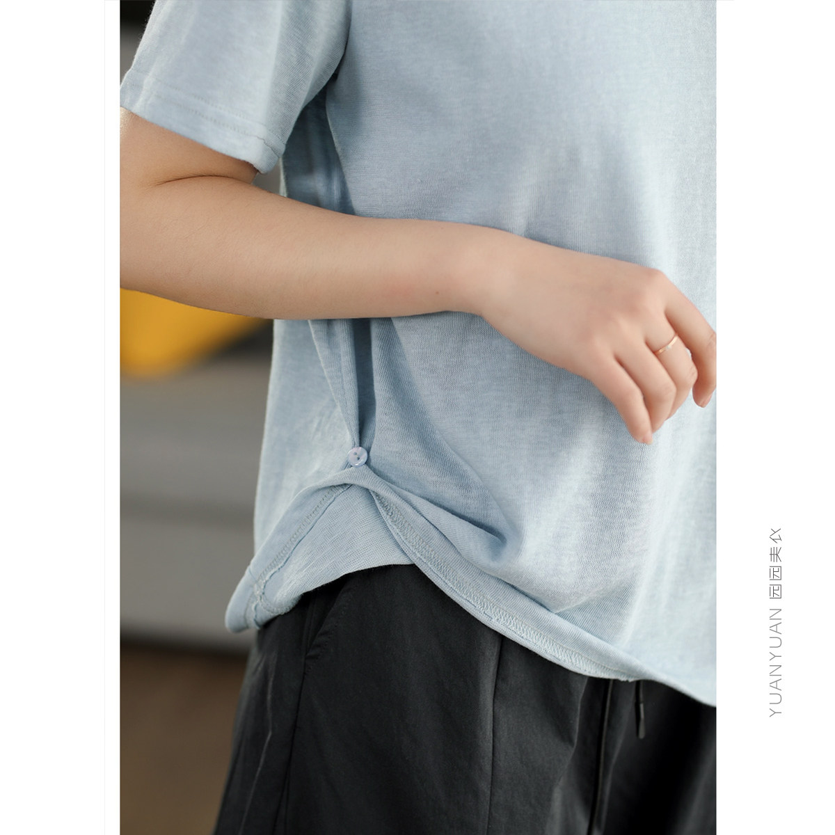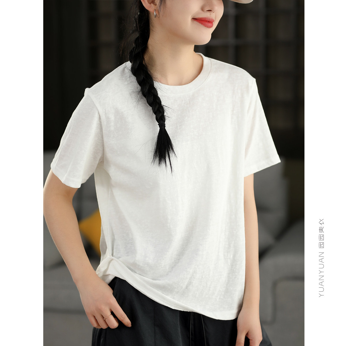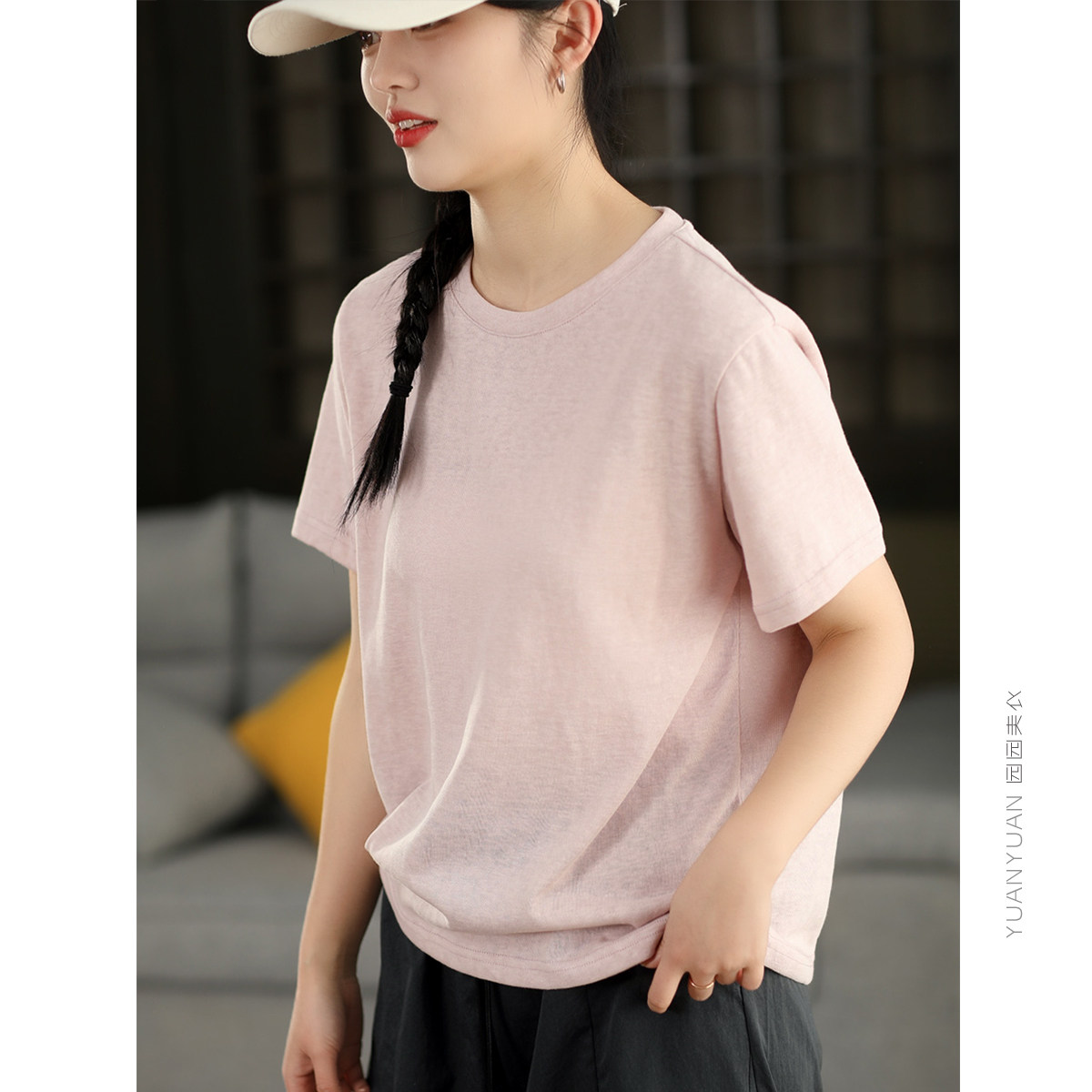 园园美衣复古莱赛尔亚麻短袖 显瘦T恤休闲纯色圆领套头上衣 女夏季