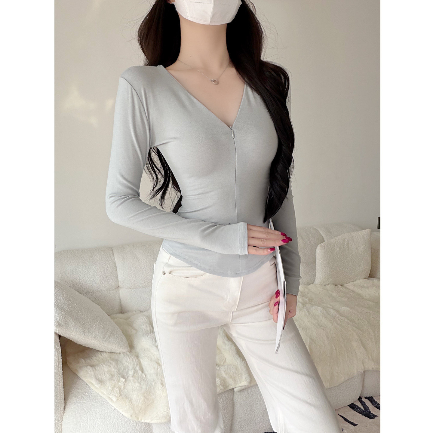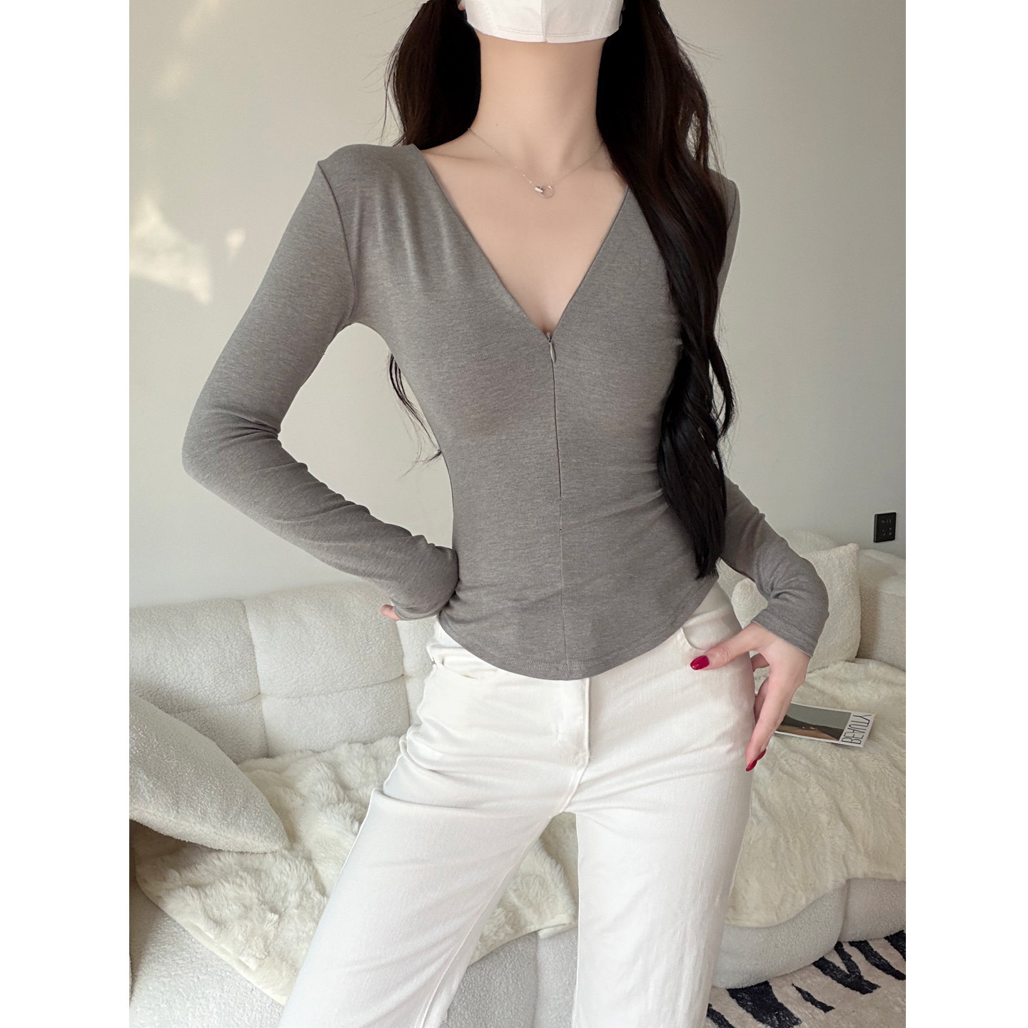 新品 上衣春季 正肩T恤纯色收腰显瘦打底衫 低胸深V领拉链半开襟长袖
