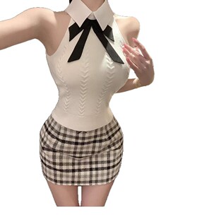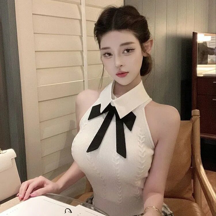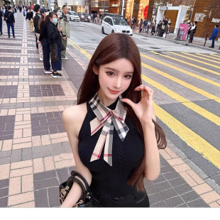 辣妹显瘦收腰外穿 上衣 纯欲风挂脖针织背心女 翻领蝴蝶结无袖