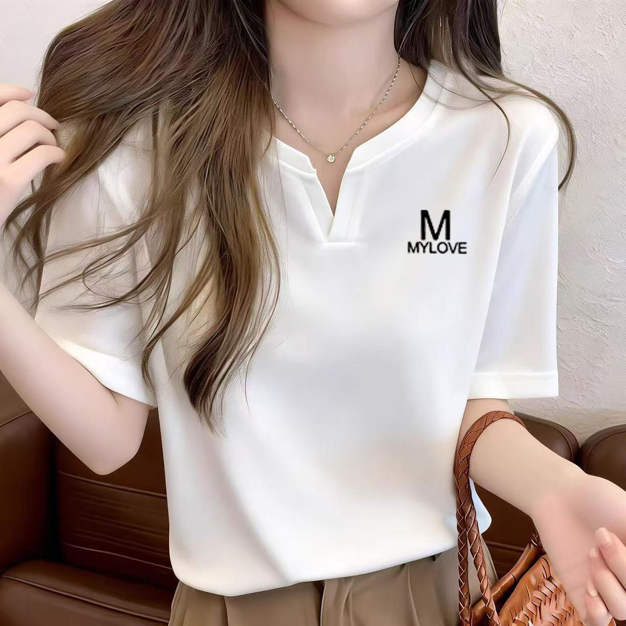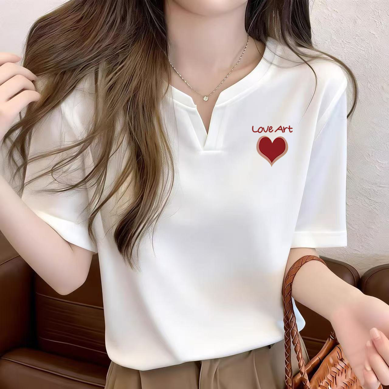 v领体恤衫 正肩短袖 显瘦半袖 宽松大码 心形印花纯棉上衣 白t恤女夏季