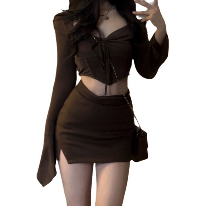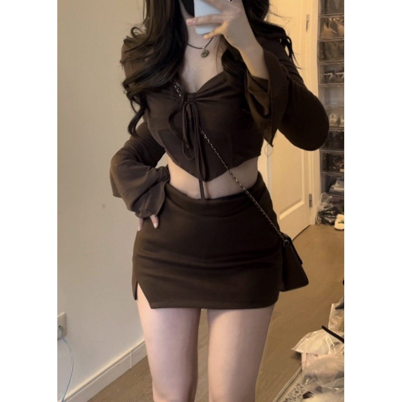 包臀短裙两件套 上衣 纯欲风辣妹小个子套装 春秋甜美抽绳褶皱短款