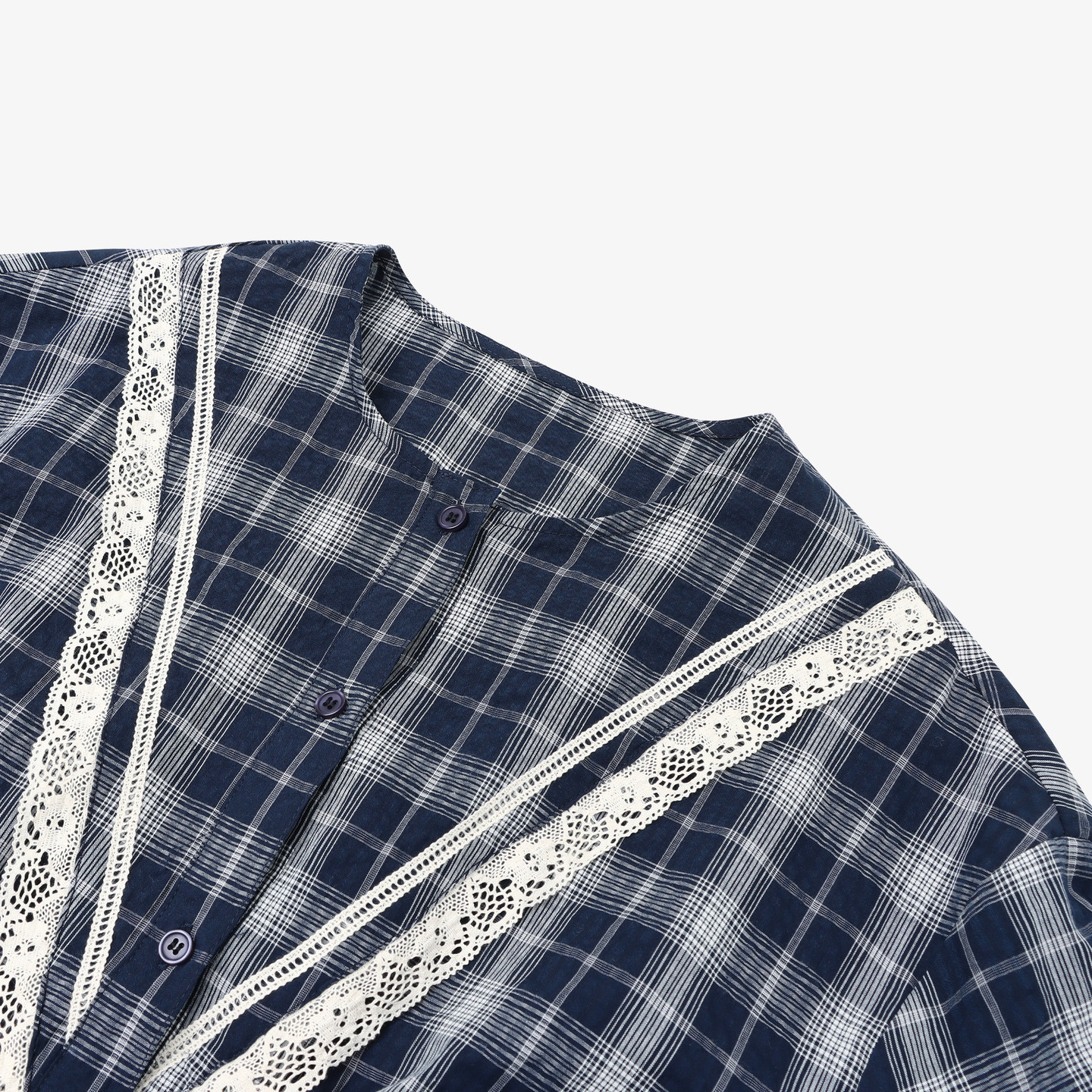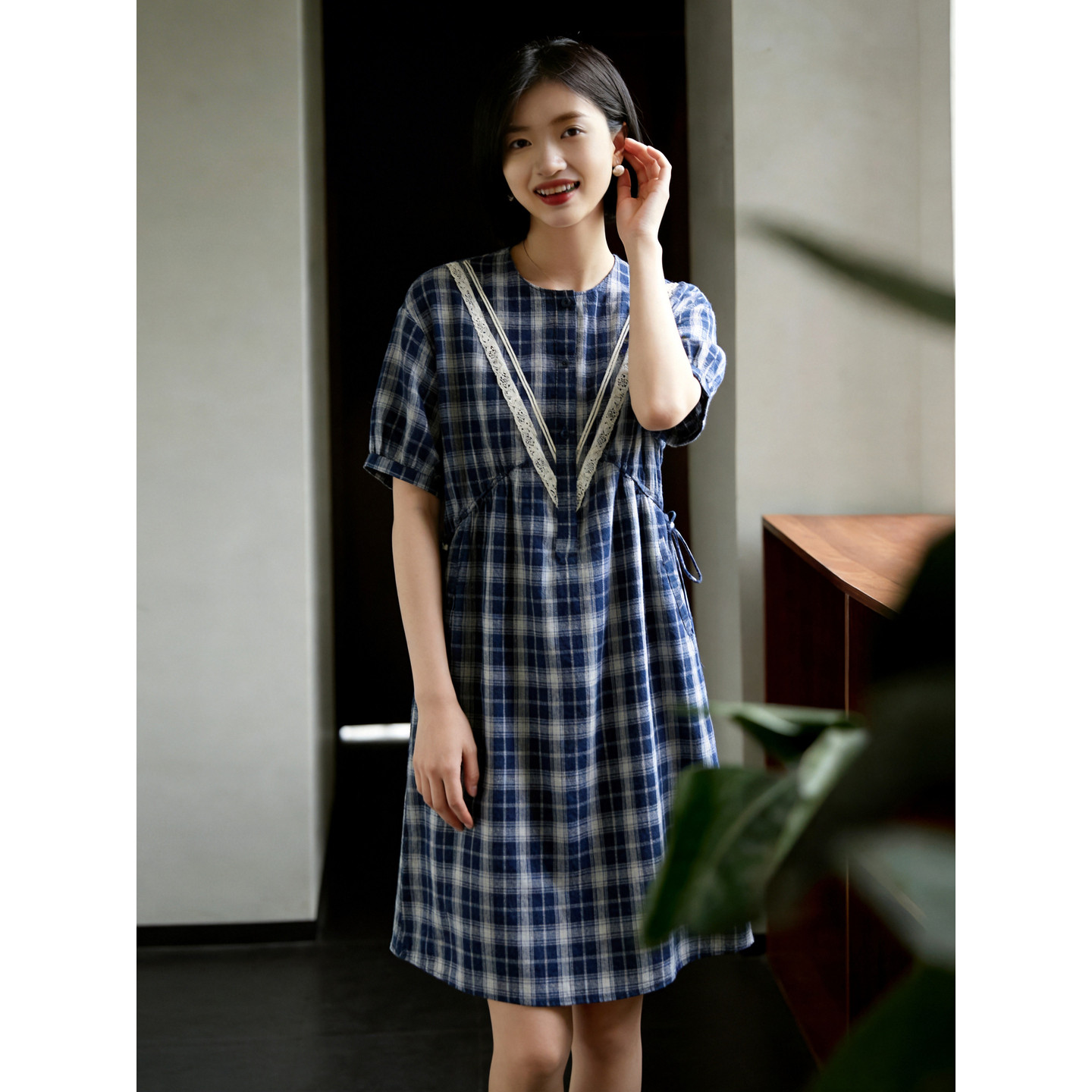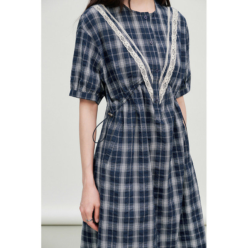 修身 Basic 新款 百家好蕾丝拼接格子连衣裙女夏季 收腰中长裙 House