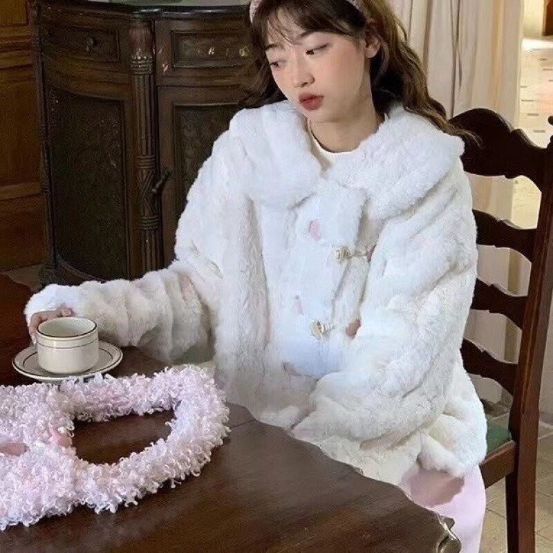 Rabbit Fur Coat Style Fluffy Ecofriendly Short Sweet Lapel