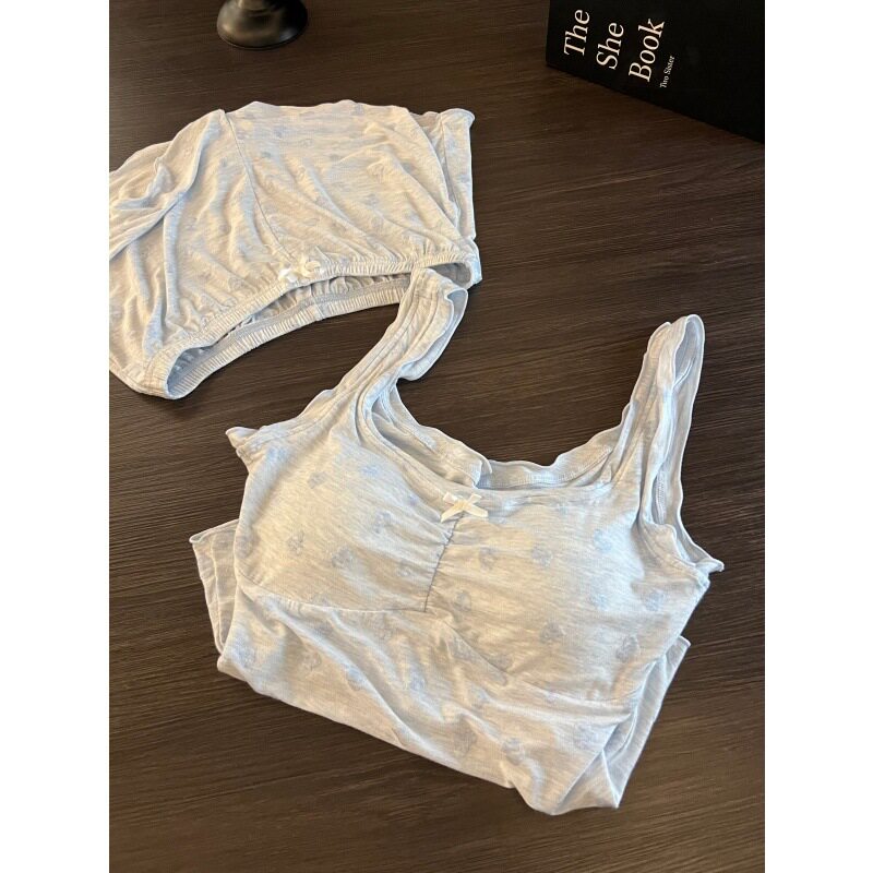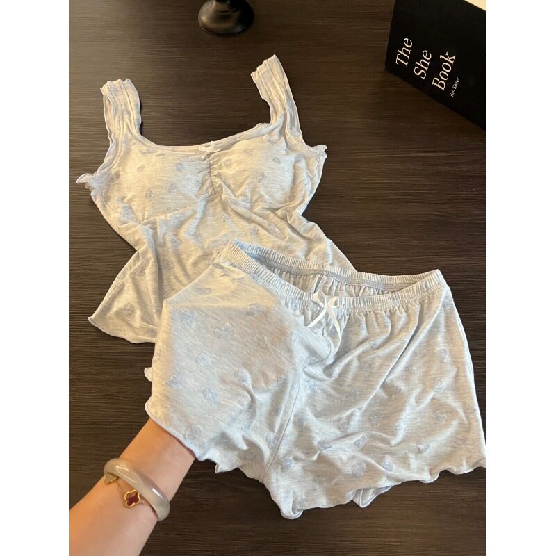 韩系甜美爱心印花带胸垫睡衣女夏款 家居服两件套 宽松舒适吊带短裤