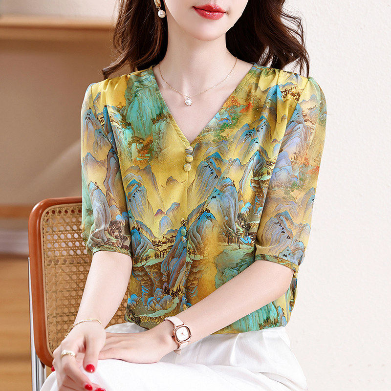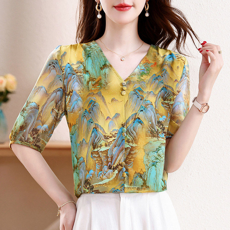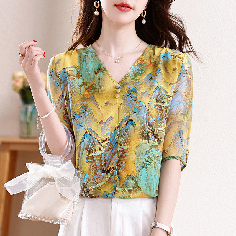 2025夏新款 小衫 洋气桑蚕丝上衣 女士碎花短袖 杭州高端大牌真丝衬衫