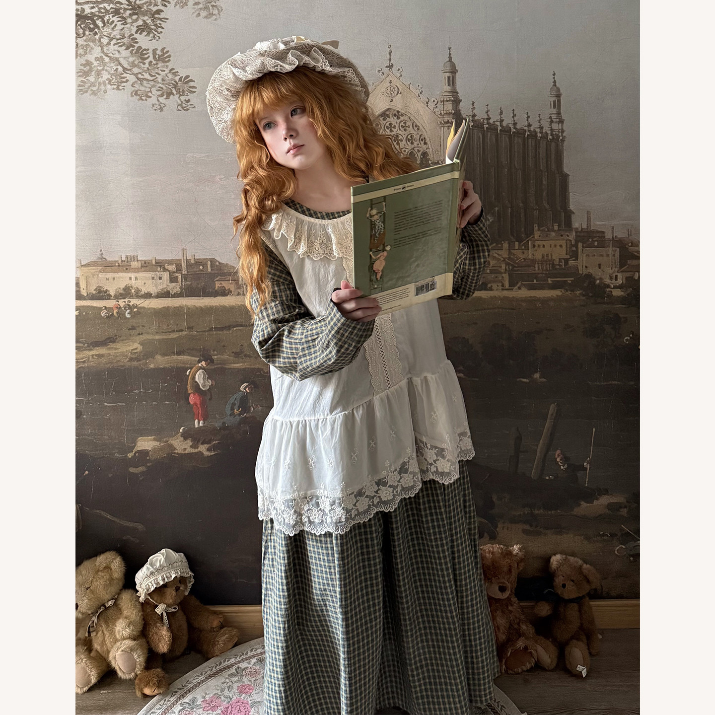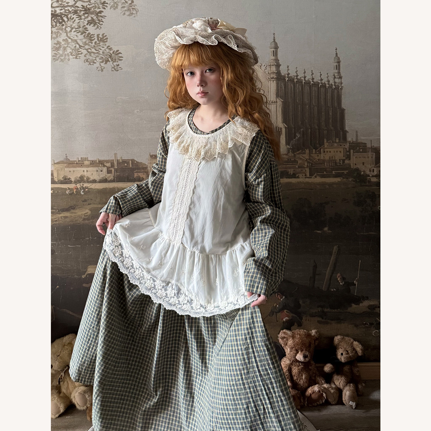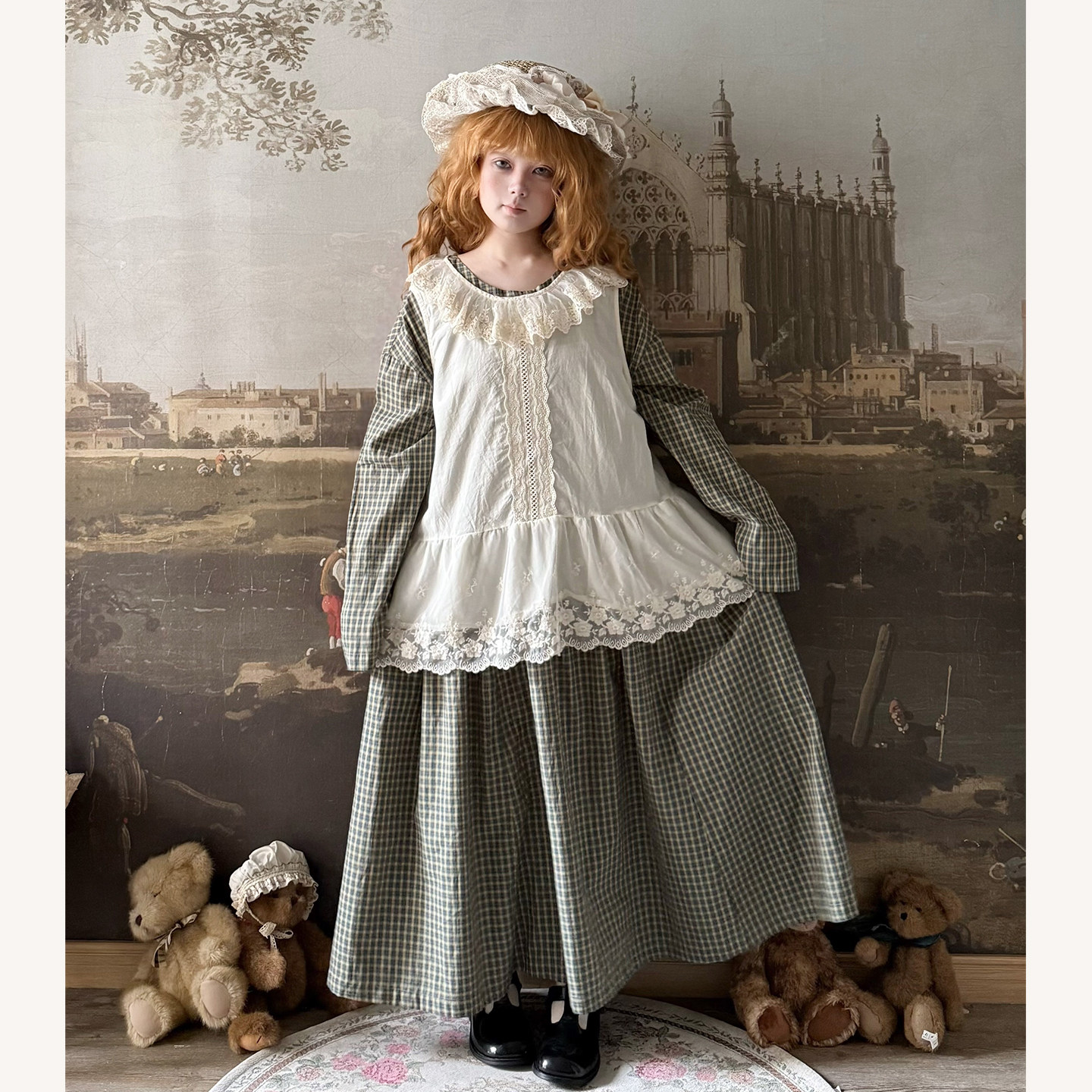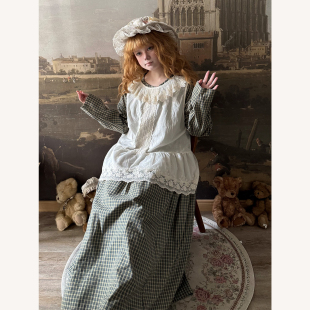 格子连衣裙两件套 背心长袖 Labeau 荷叶边圆领提花蕾丝无袖