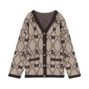 妖精 老钱风慵懒高级感 口袋老花咖色毛衣外套女2026年春秋新款