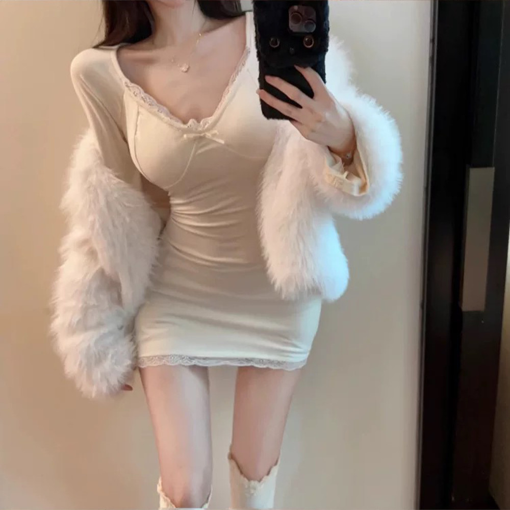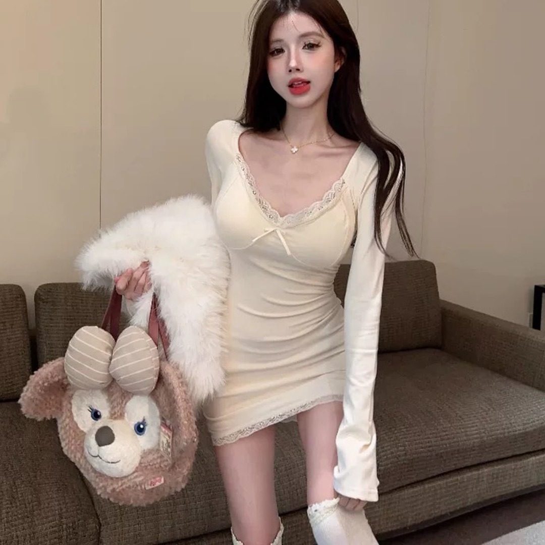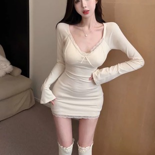 蕾丝花边穿搭性感包臀裙 连衣裙女设计感修身 秋冬纯欲法式 V领长袖