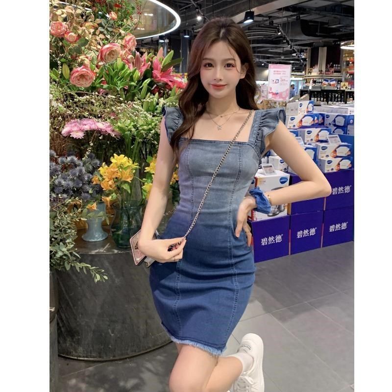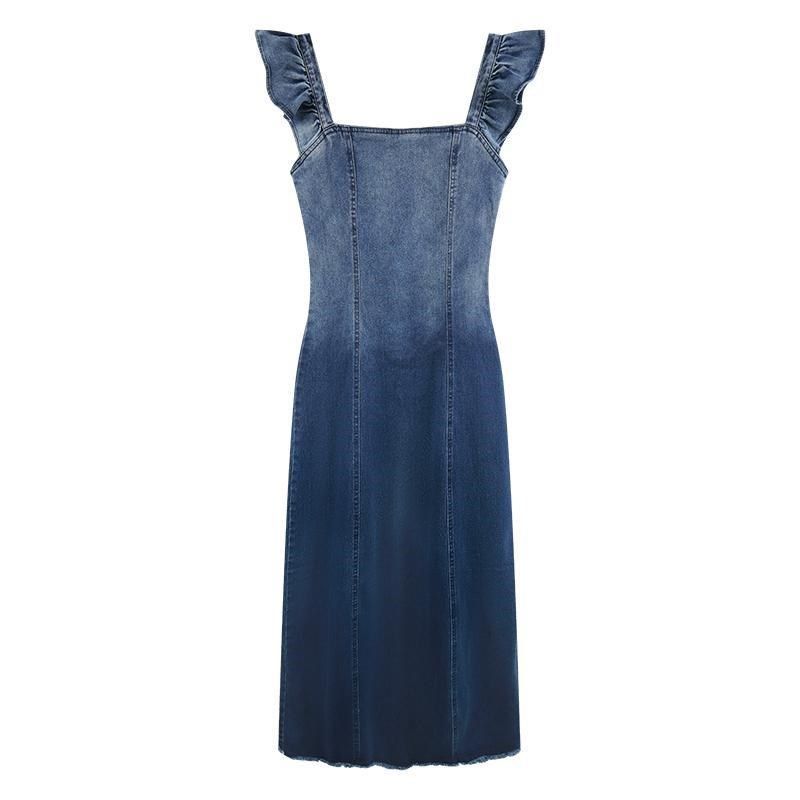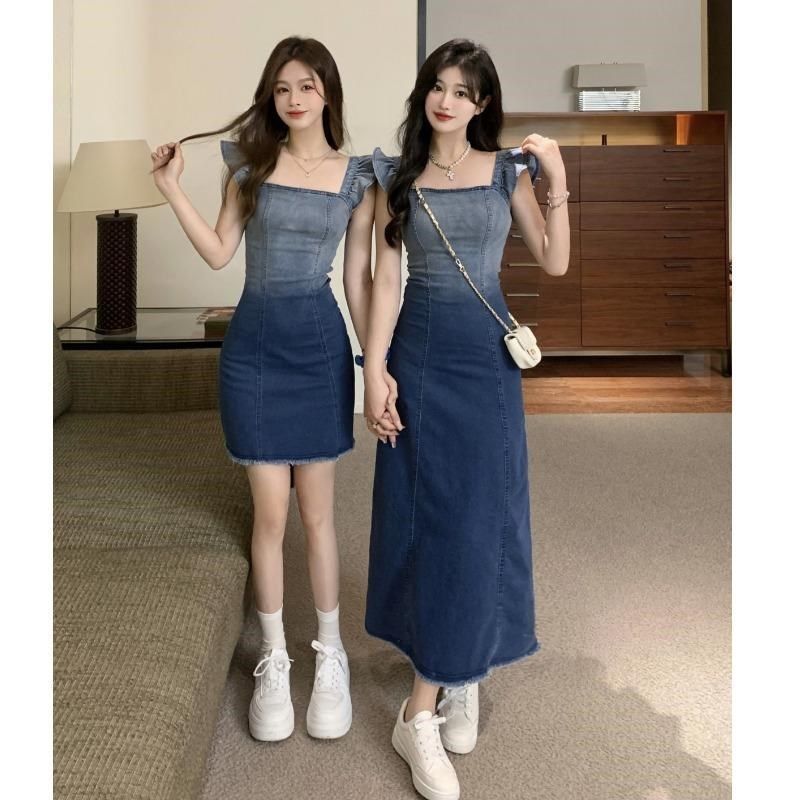 毛边闺蜜装 小个子牛仔渐变背带长裙小飞袖 女连衣裙子 新款 2024夏季