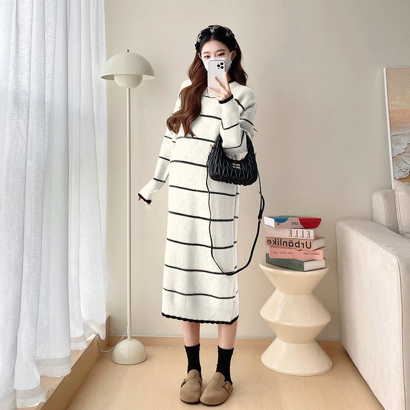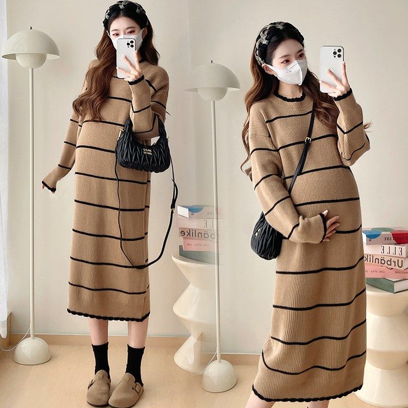 秋冬装 韩版 长袖 孕妇裙秋装 怀孕裙子 条纹针织连衣裙2024新款 孕妇装