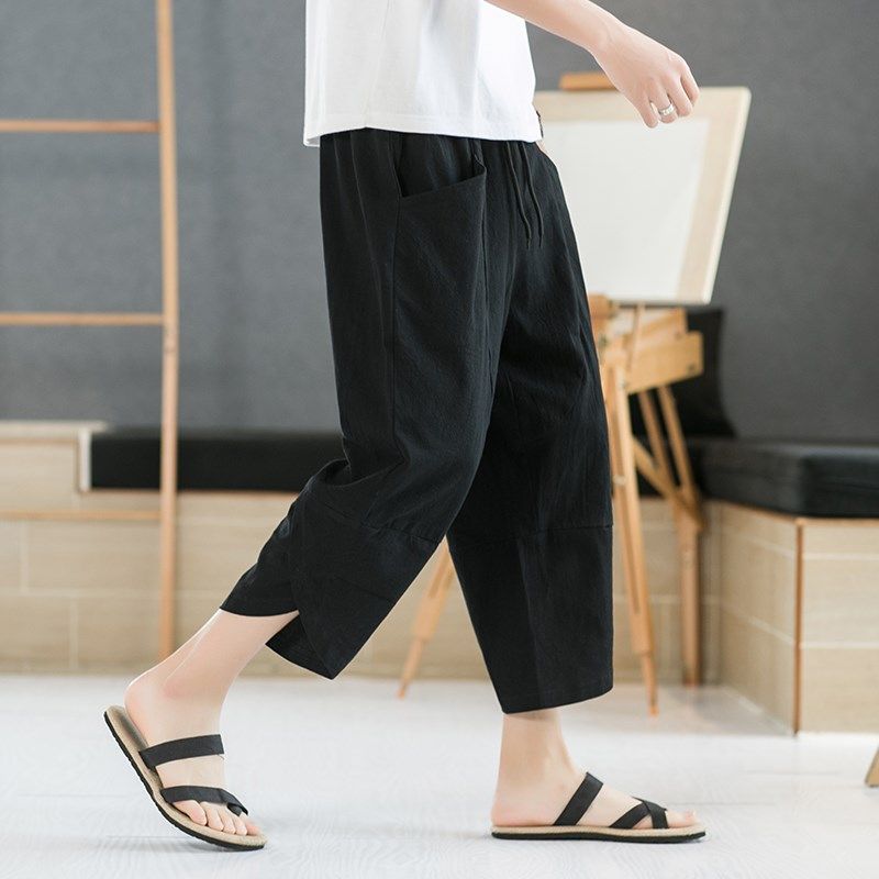 纯棉薄款 夏季 大码 宽松休闲亚麻裤 棉麻八分裤 潮流胖子九分裤 男士